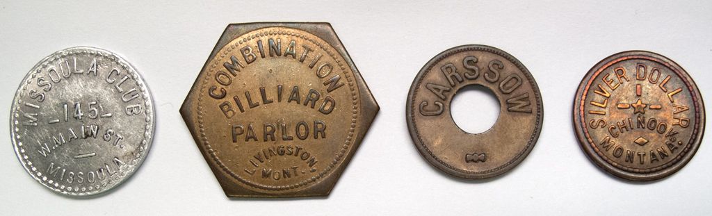 1) Cassow // GF 5c IT. From Big Sandy. Probably a pool or billiards hall. 2) Silver Dollar / Chinook / Montana // GF 5c IT. 3) Missoula Club / 145 W. Main Street / Missoula // GF 10c IT. 4) Combination Billiard Parlor / Livingston / Mont. // GF 12 1/2c IT.