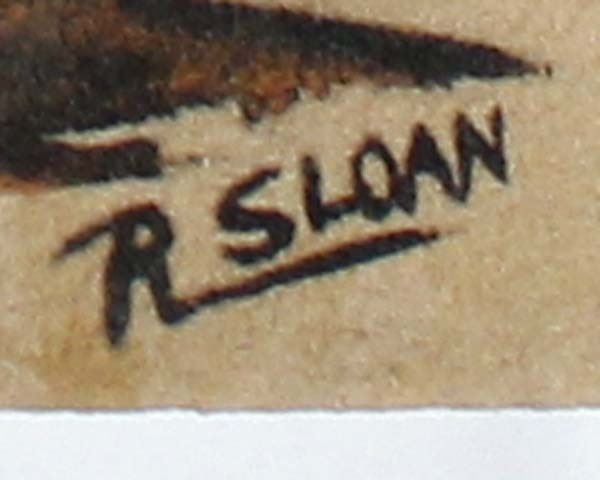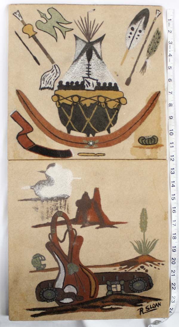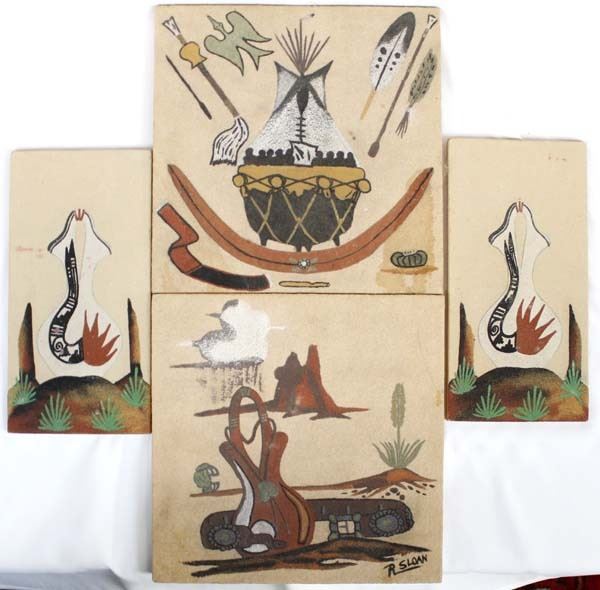 Four Native American Navajo Sand Paintings, by R. Sloan. 2 measure 6'' x 12'', 2 measure 12'' x 12''.