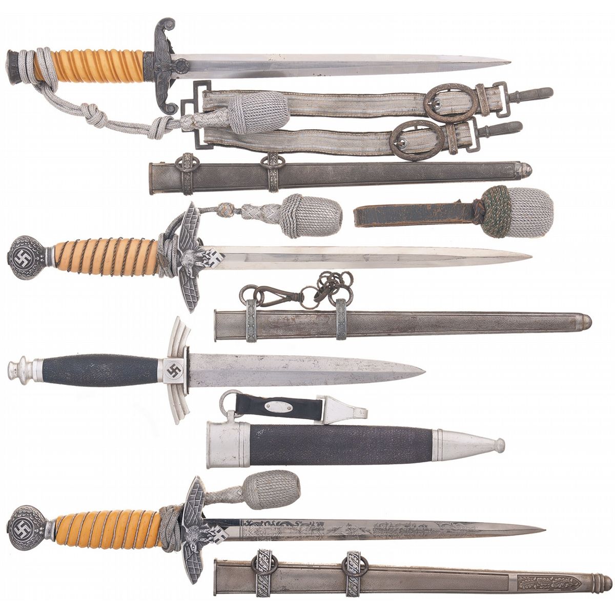 1) Weyersberg (Solingen) Army dagger, 10" blade, yellow celluloid grip, silver portapee, metal sheath, hanger. 2) 2nd Pattern Luftwaffe dagger, 9 3/4" blade, faint Solingen makers mark, wire wrapped grip, silver portapee, metal sheath. 3) Air Sport League dagger, 6 7/8" blade, faint makers mark, blue painted grip and sheath, leather hanger. 4) Emil Voos Luftwaffe dagger, 10" etched blade, wire and celluloid grip, silver portapee, metal grip. Pommel loose. With extra portapee. Overall very good.