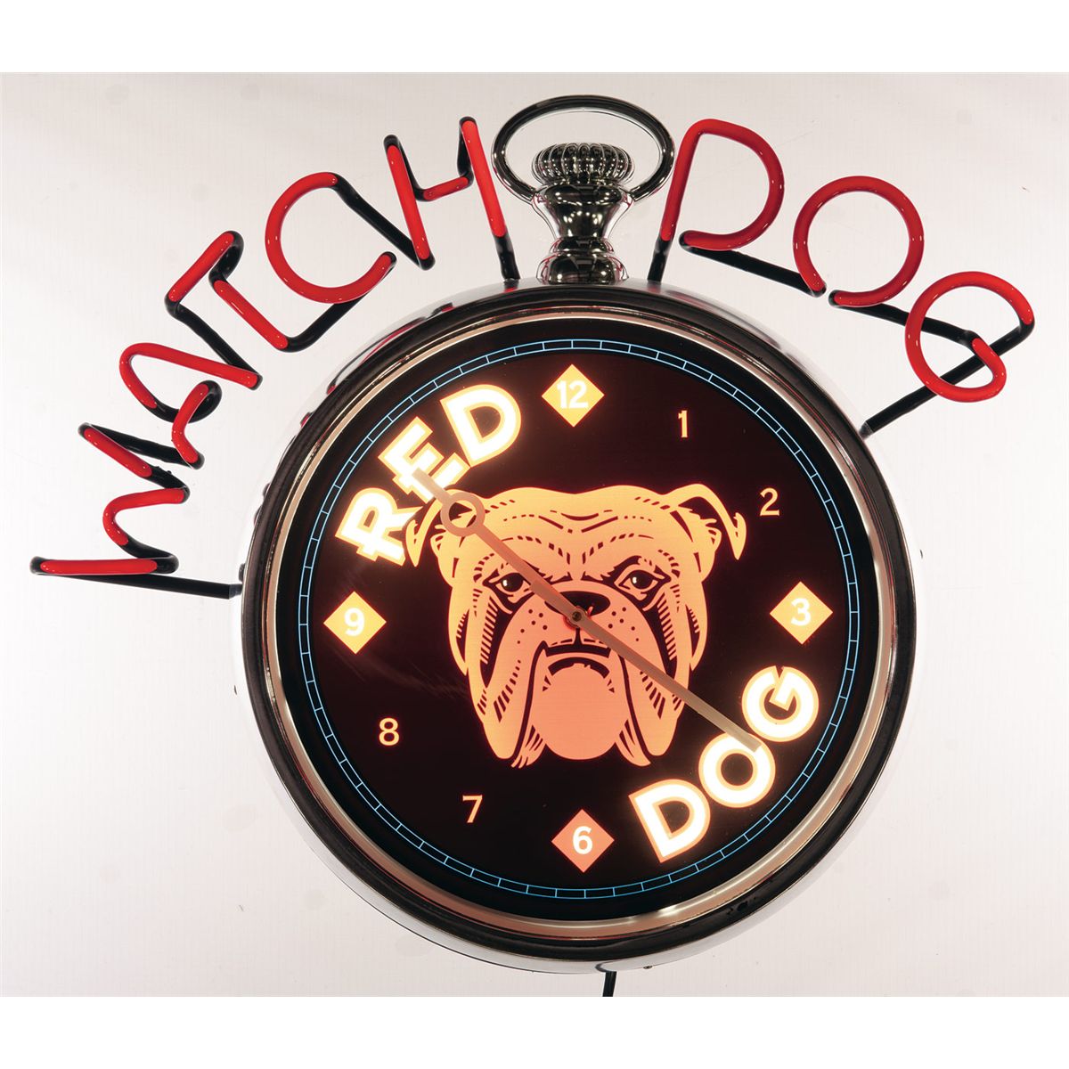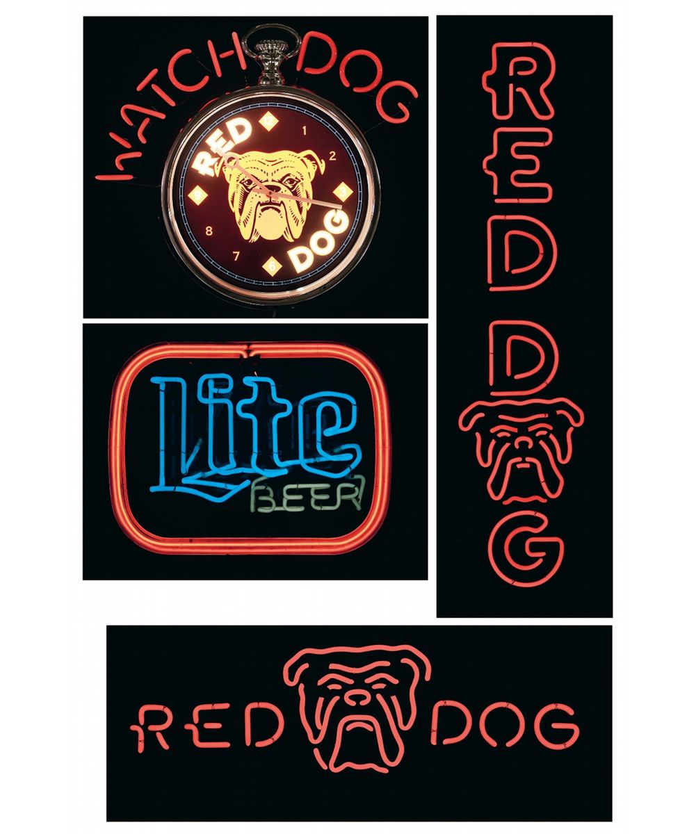 1) Red Dog Watch Dog Neon Beer Sign and Clock with Original Box - All neon lights work. 27" wide x 22" tall with 8' cord. With original Red Dog box. 2) Red Dog Vertical Neon Beer Sign - All neon lights work. 11 1/4" wide x 39 1/2" tall with 8' cord. With unmarked box. 3) Miller Lite Beer Neon Beer Sign - All neon lights work. 21" wide x 17" tall with a 5 1/2' cord. 4) Red Dog Neon Beer Sign - All neon lights work. 34 1/2" wide x 13" tall with a 9 1/2' cord.