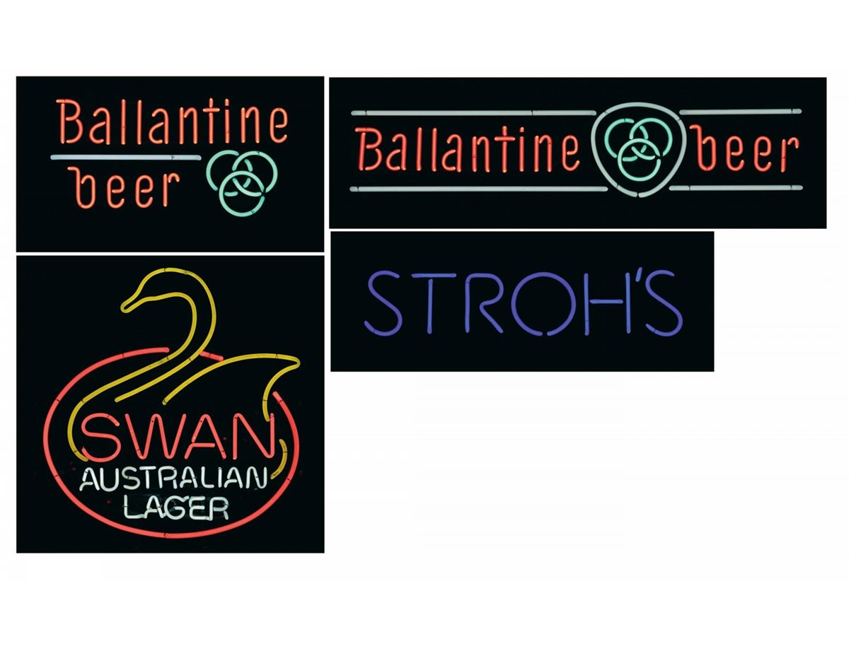 1) Ballantine Beer neon beer sign - All neon lights work. 22 1/2" wide x 14" tall with a 6' cord. 2) Swan Australian Lager neon beer sign - All neon lights work. 23 1/2" wide x 26 1/4" tall with 1 5 1/2' cord and 1 6' cord. 3) Ballantine Beer neon beer sign - All neon lights work. 39" wide x 11" tall with 6' cord. 4) Stroh's neon beer sign - All neon lights work. 30" wide x 8" tall with a 9 1/2' cord.