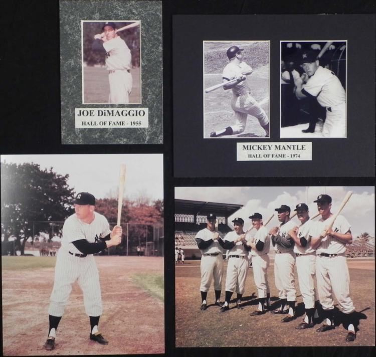 The hottest team in baseball seems like that can't be stopped. Ripping of ten wins in a row, who knows when they will lose next. When you endless supply of money and like to buy up the league, it's understandable why you're team is so good. In case you are wondering what team we are talking about, it's the New York Yankees and we are offering four photographs, which contain at least three hall of fame players in them. Two are of Mickey Mantle. One has been matted, contains two photographs, and has his name and year he was inducted into the hall of the fame at the bottom. Another photograph is of Joe DiMaggio which has also been matted and has name and the year was inducted into the hall of the fame on the bottom as well. The last photograph, we believe is from the 1950's or 1960's which displays six players, one of which is Yogi Berra. There sizes are either 5" x 7" or 8" x 10" and are in near mint condition. The question is, what is stopping you from bidding on this lot featuring some of the greatest players to have ever stepped on the field? Easy answer, nothing, so bid on them today!!