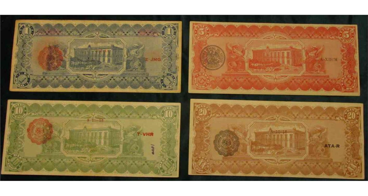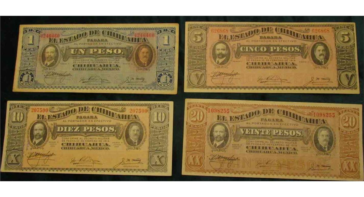 Four Note Set 1, 5, 10, & 20 Peso 1914 Revolutionary War Chihuahua Mexico Banknotes. All VF to EF.
