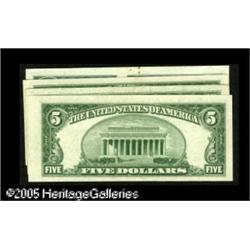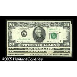 <B>Four Obstructed Printing Federal Reserve Notes.</B></I><BR><B>$5 1950B About New</B></I> with a half inch wide first face printing obstruction. <B>$10 1950A Gem New</B></I> with a small round obstruction of both the first and third face printings. <B>$10 1950B Very Fine</B></I> with a half inch wide first face printing obstruction. <B>$20 1969 EF</B></I> with a paper scrap irregular back obstruction (some paperclip rust). 4 notes Lot:15353