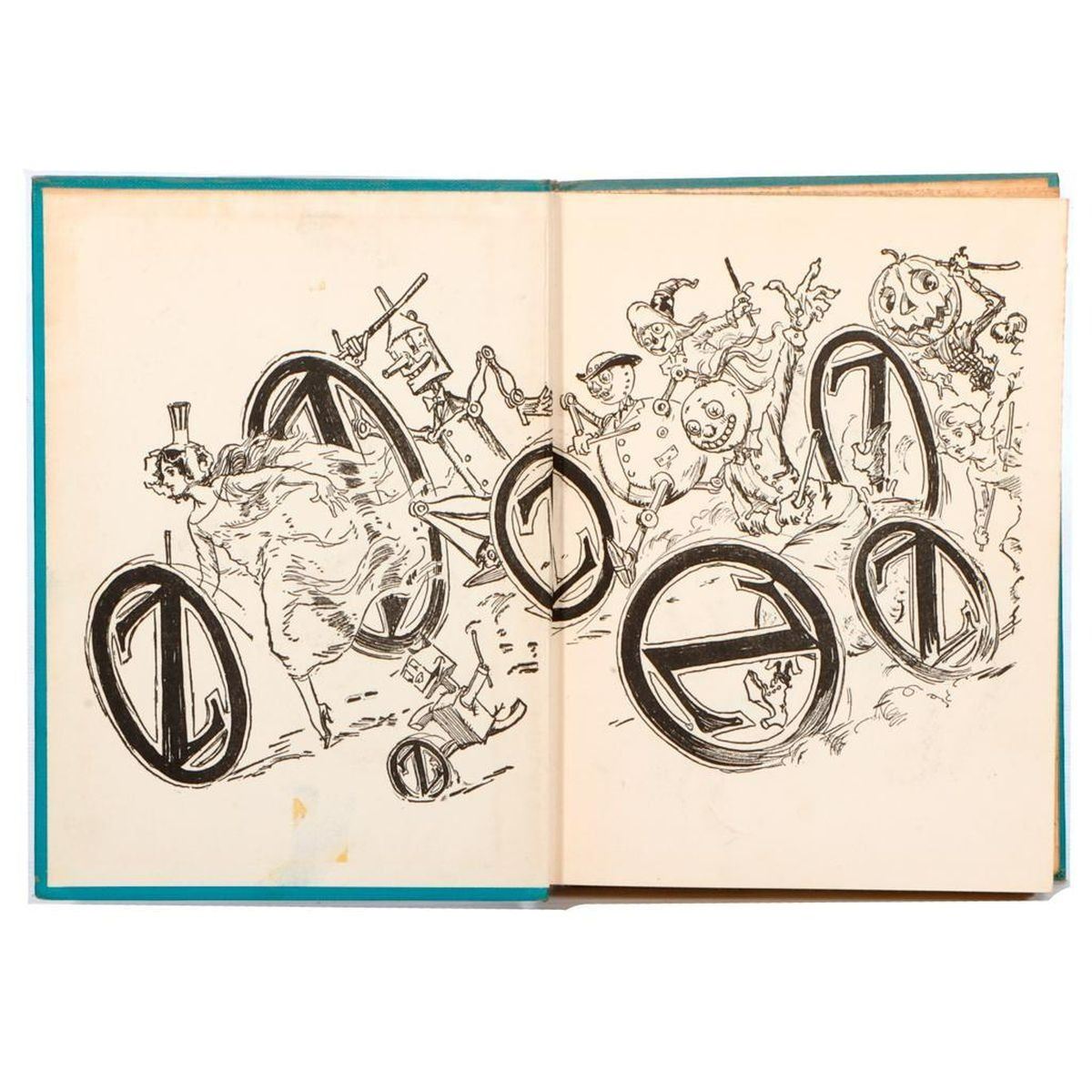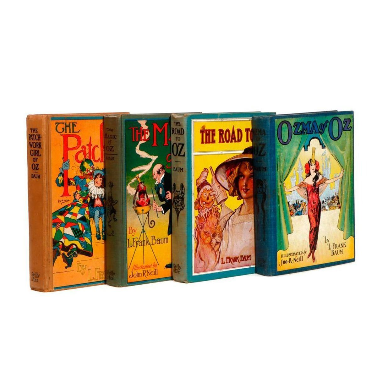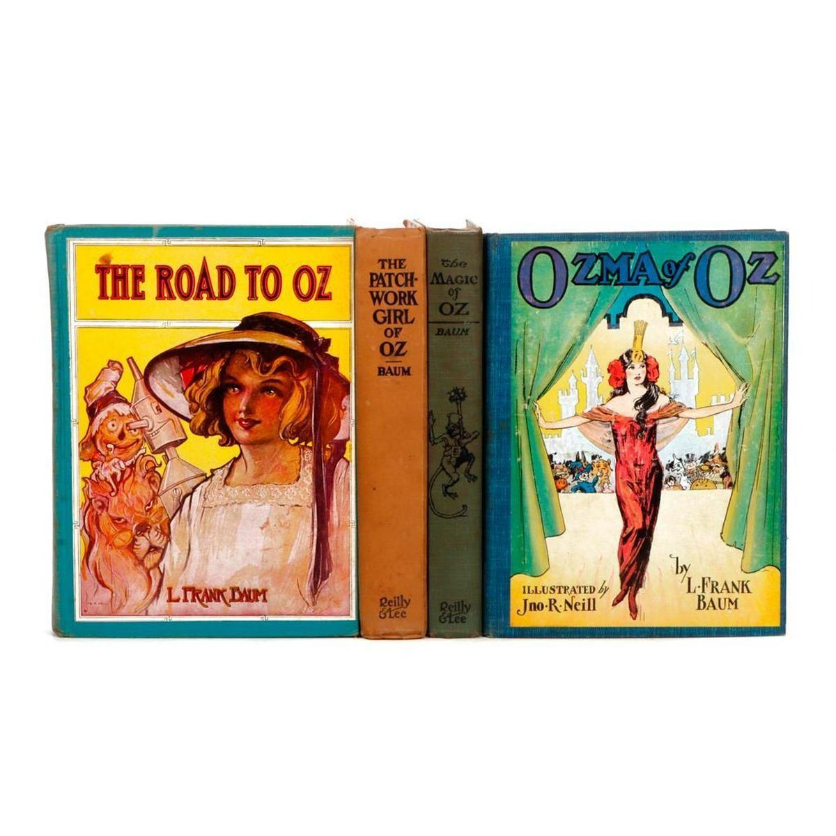 Later printings of early editions illustrated by John R. Neill; Chicago, The Reilly & Lee Company. The group in overall good condition, all with child owner signatures and/or inscriptions. BAUM, FRANK L. 1.) Ozma of Oz, 1907. 2.) The Magic of Oz, 1919. 3.) The Road to Oz, 1909. 4.) The Patchwork Girl of Oz, 1913.