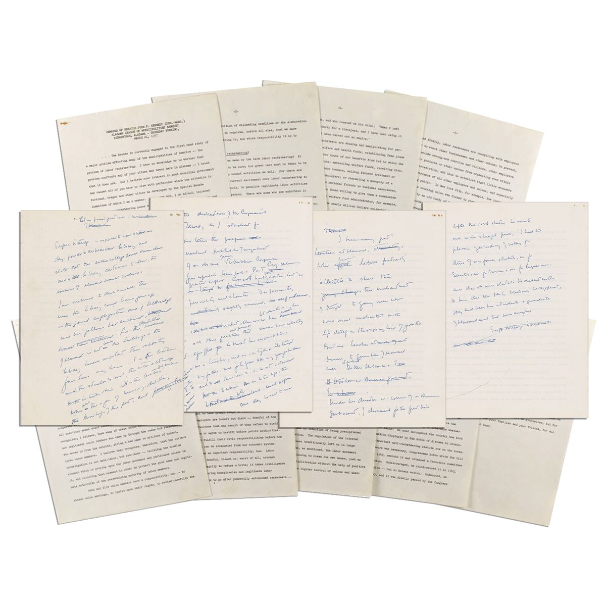 John F. Kennedy autograph manuscript unsigned, with numerous corrections to his own notes. Written as a Massachusetts senator in 1957, JFK pens his thoughts about his alma mater, Harvard University, to be incorporated in ''College Yard: Minutes by Thirty-Nine Harvard Men'' published in October of 1957 and edited by Brooks Atkinson, who asked Kennedy to write the piece. Kennedy pens over 400 words in blue ink on the back of a speech relating to labor racketeering, dated 21 March 1957. Autograph manuscript reads in full: ''Let us praise great men - Professor Kittredge is supposed to have stopped one day, pointed to the Harvard Library, and stated that the entire college could burn down and if that Library continued to stand, the essence of Harvard would endure. I am inclined to think however that even the Library could have gone up in the general conflagration, and if Kittredge and his fellows had endured, for the essence of Harvard is not the buildings - the Library, however important their supporting functions may be. It is the teachers and the students and the interrelationships between them. It is the teachers not the Library who are the organ of memory, distilling the knowledge of the past, and I knew many great teachers at Harvard who have patiently attempted to show their the enchantment of thought to young men who were more enchanted with life itself in this spring time of youths. But one teacher known to generations of Harvard men stands out - Arthur Holcombe. Under his direction in a course in American Government, I discovered for the first time the distractions of the Congressional Record, as I studied for one term the eventual political extinguishment of an obscure junior Republican Congressman from upstate New York. But Prof. Holcombe's greatest impact was not his vast erudition, but in personality and character. Dispassionate, reserved, self-restrained, without illusions but idealistic, he combined all these qualities and principles, that made him ideally equipped for to meet his responsibilities, as a teacher, and as a citizen. He taught my father, and forty years later my younger brother, and to them, and to all, he set a standard to which in later life, they all could repair. Deeply moved by the things which he thought important, he refused with wry detachment those debates over trivialities which are incidental to our limited imagination and harbor too closely around loneliness. One day he said to me after the 1946 election he said to me with cheerful pride, 'I had the pleasure yesterday of voting for three of my former students, one for Senator, one for Governor & one for Congressman, and they were all elected.' It did not matter to him that the party labels may be different, they had been his students and graduates of Harvard and that was enough.'' Pages measures 8'' x 10.5''. Handwritten portion runs four pages; speech is ten pages. Toning and staple holes, otherwise near fine with bright handwriting.