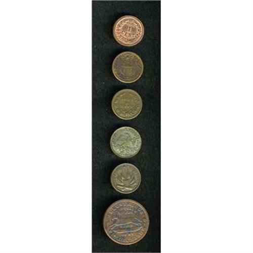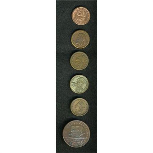 <B>Four Patriotics and Two Miscellaneous.</B></I> The tokens grade VF or XF but some are cleaned. The lot includes: <B>Fuld-1/391a, R.1; Fuld-11/298a, R.1; Fuld-26/340a, R.2, Fuld-82/352Aa, R.1</B></I>; a Hard Times token, <B>HT-34;</B></I> and an <B>1850's George Washington token, </B></I>brass, obverse of Miller-Pa-126 or Baker-531 but reverse differs.<BR><BR><b>Shipping:</b> Coins & Currency (<a target="_blank" href="http://www.heritageauctions.com/common/shipping.php">view shipping information</a>)