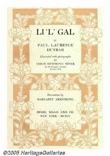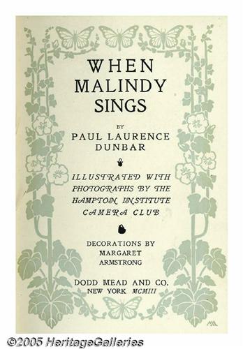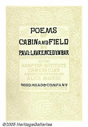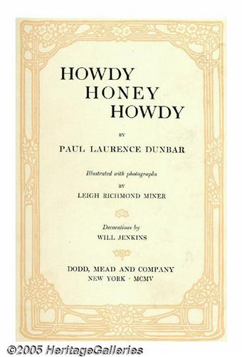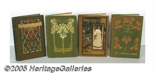 <B>Four Paul Laurence Dunbar First Edition Poetry Books</B></I> Dunbar was the first African American poet to gain national critical and popular acclaim. The son of former Kentucky slaves, he grew up in Dayton, Ohio and went to high school with Orville and Wilbur Wright, where he excelled in debating, journalism and literature. Influenced by his mother, Matilda, who loved poetry and encouraged her children, Dunbar started writing and reciting poetry at the age of six. The first of the four books offered here is <I>Howdy Honey Howdy,</B></I> illustrated with photographs by Leigh Richmond and decorations by Will Jenkins. Published in New York by Dodd, Mead and Company in 1905; brown cloth with pictorial and gilt stamping and a photographic illustration laid down; first edition; colophon states printing date of August, 1905; fine, tight condition. Next is <I>Poems of Cabin and Field,</B></I> illustrated with photos by the Hampton Institute Camera Club and decorations by Alice Morse. Published in New York by Dodd, Mead and Company in 1899; first edition; green cloth with colorful decorations and gilt lettering (some light fading); a few loose pages repaired internally. The third book is entitled <I>Li'l' Gal,</B></I> illustrated with photographs by Leigh Richmond Miner and decorations by Margaret Armstrong. Published in New York by Dodd, Mead and Company in 1904; green cloth with colorful decorations and gilt lettering; first edition; a few pages a bit loose but a very nice copy. The last of these excellent offerings is <I>When Malindy Sings,</B></I> illustrated with photographs by the Hampton Institute Camera Club and decorations by Margaret Armstrong. Published in New York by Dodd, Mead and Company in 1903; brown cloth with colorful flower designs and gilt lettering; first edition; fine condition. A rare opportunity to own four original books by this important writer. Lot:250