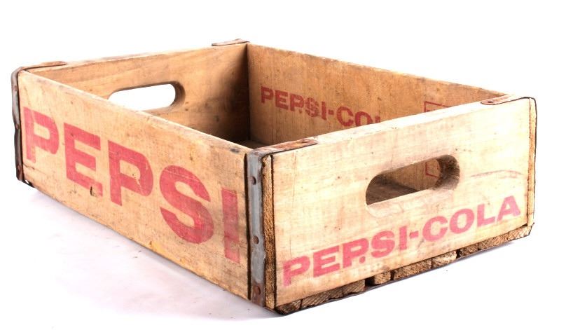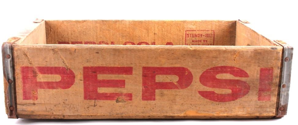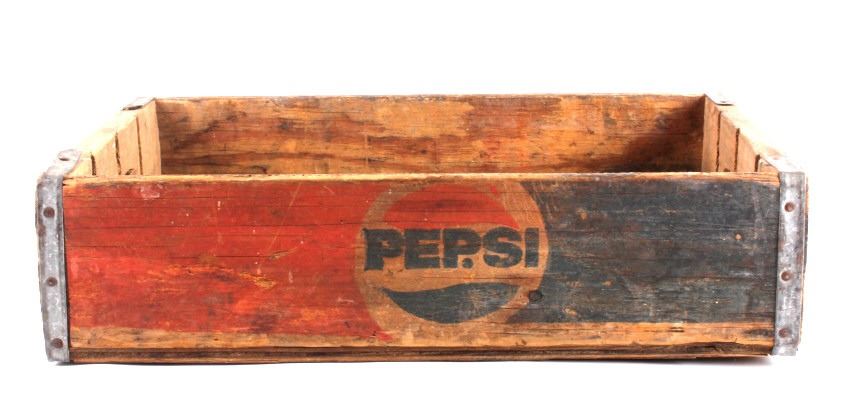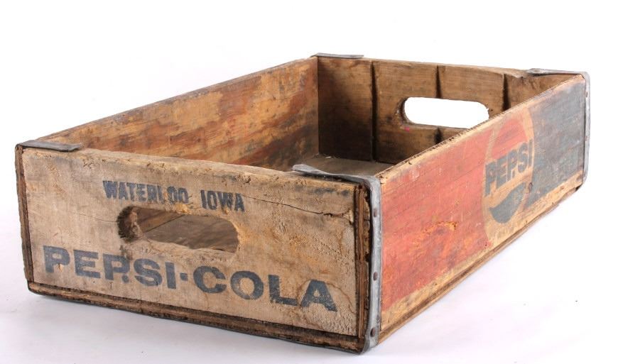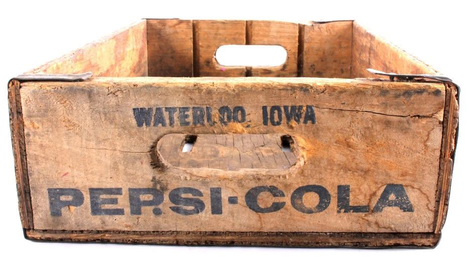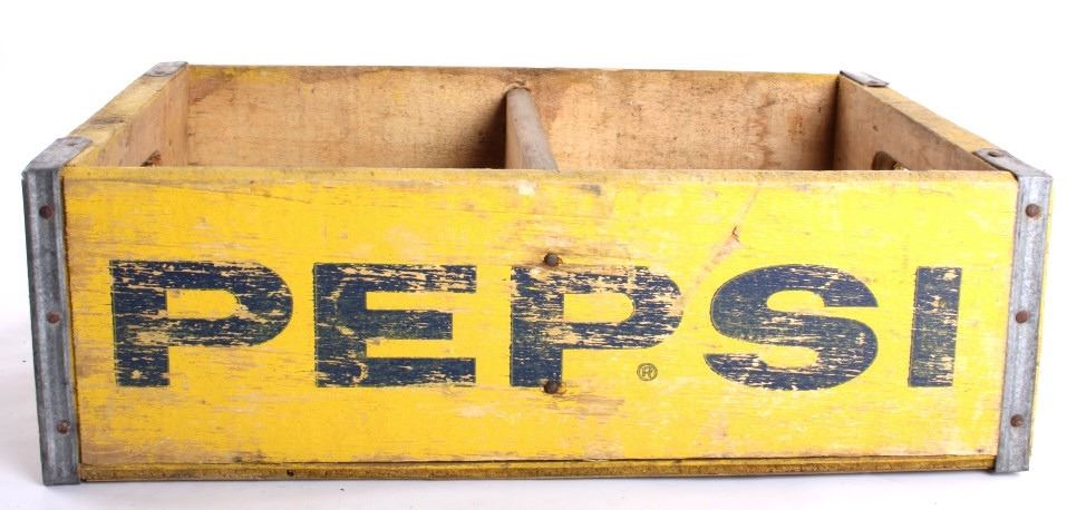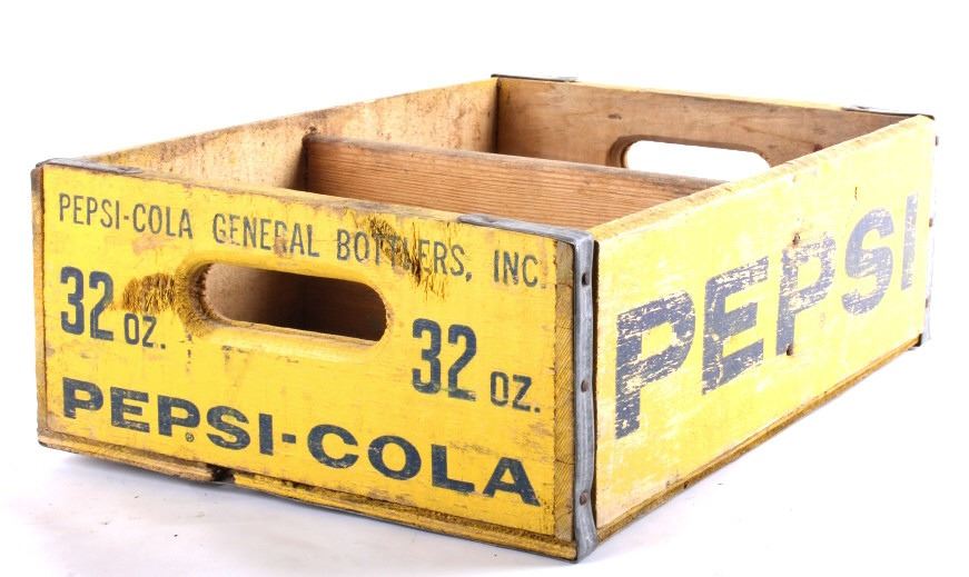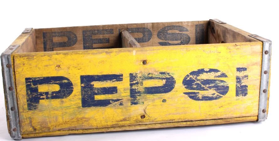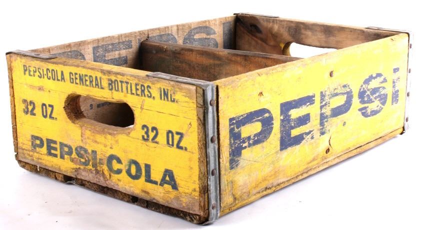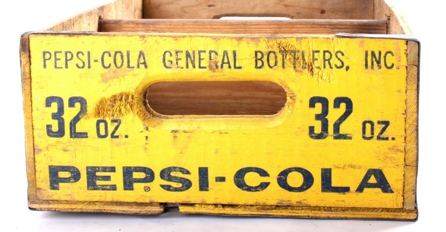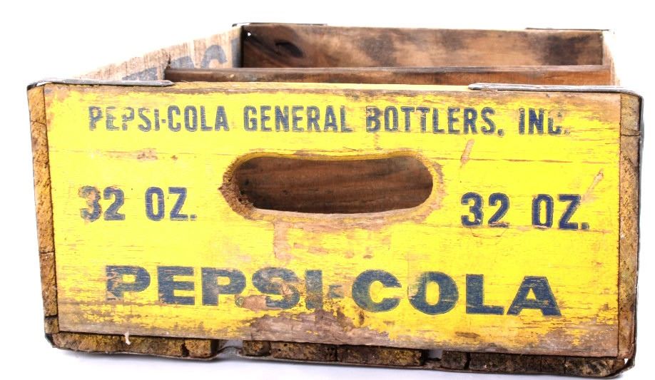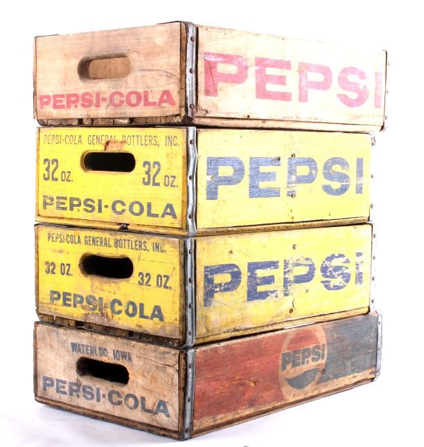 Tis is 4 Pepsi- Cola wooden crates. The two yellow crates are marked "Pepsi- Cola General Bottlers, INC. 32 oz. Pepsi-Cola." The crates have marking inside with 1973 & 74. The wooden crate with Pepsi marked in red has 1972 stamped inside it. The last crate has The Pepsi logo on the sides and the ends are marked "Waterloo, Iowa Pepsi-Cola".