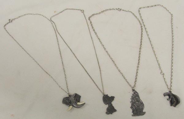 Four Pewter Necklaces, elephant measures end to end 17'', ship, Snoopy dog, and Cobra head. SHI $15.