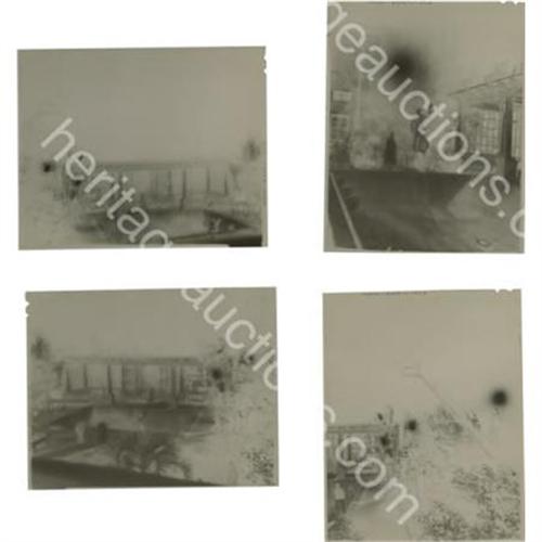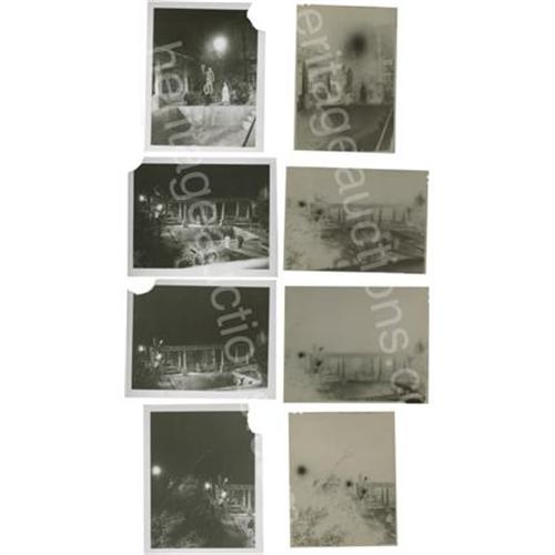 <B>Four Photos and Negatives from "Rebel Without a Cause."</B></I> Dark, atmospheric shots of the old mansion set of <I>Rebel</B></I> where Jim, Judy, and Plato gather before the tragic climax. This eerie set with its broken windows and empty pool becomes even more haunting when seen with camera boom crane, klieg lights, visible tech crew members and the three stars almost dwarfed on the massive set. Each picture has border damage, but the negatives are clean and complete. These ultra-rare pictures make you feel you're actually on this remarkable set.<BR><BR><b>Shipping:</b> Flat Material, Small (<a target="_blank" href="http://www.heritageauctions.com/common/shipping.php">view shipping information</a>)