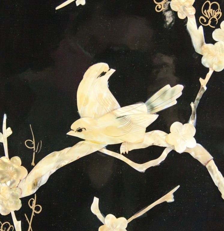 Four-piece Chinese lacquer screen panel. Decorated with scenes of birds and trees. 92 x 31 cm each.