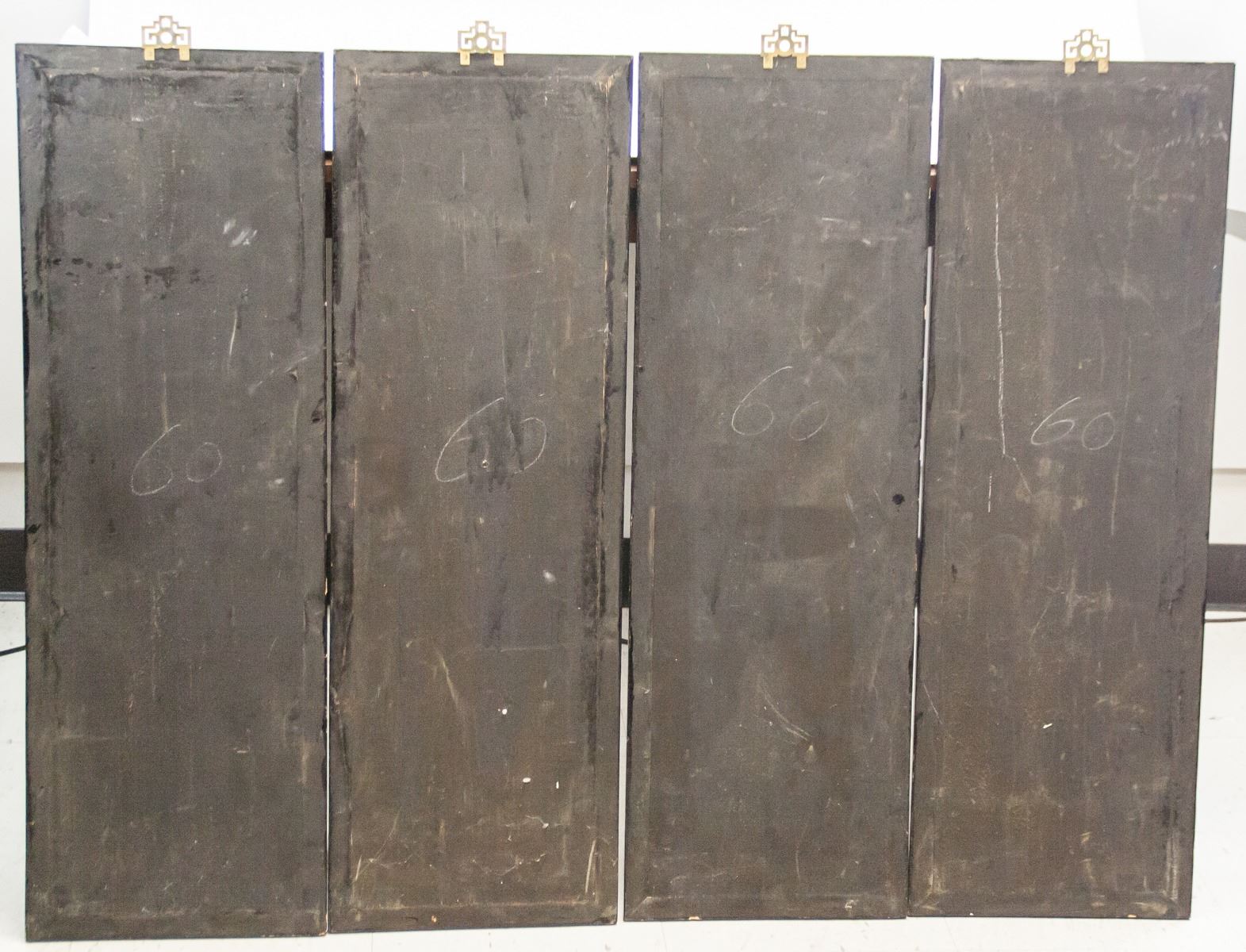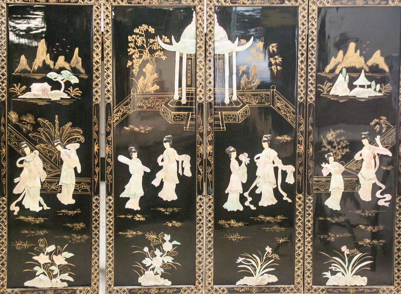 Four-piece Chinese lacquer screen. Featuring garden scene with beauties and pavilion. 91 x 30 cm (35.8 x 11.8 inch)