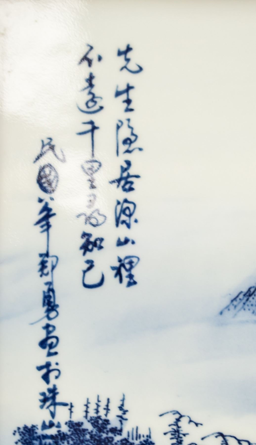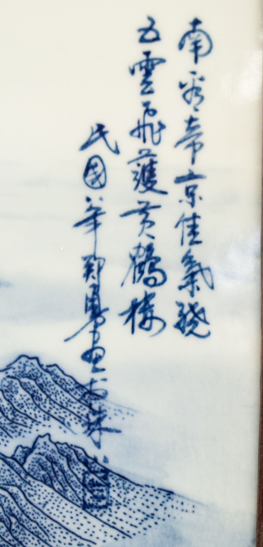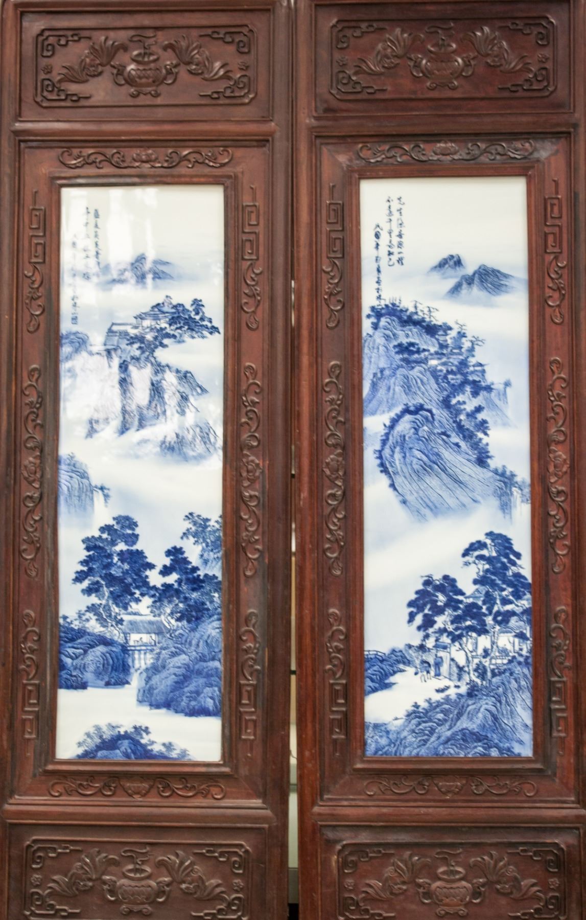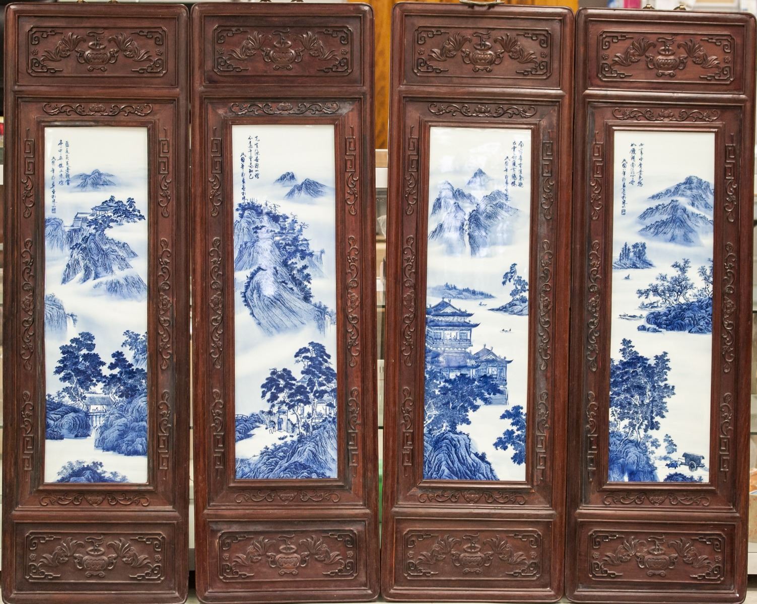 Four (4) pieces porcelain plaque screens. Featuring blue and white mountainous landscape. Signed Zheng Yong. 126 x 36 cm, 8.5kg (each)