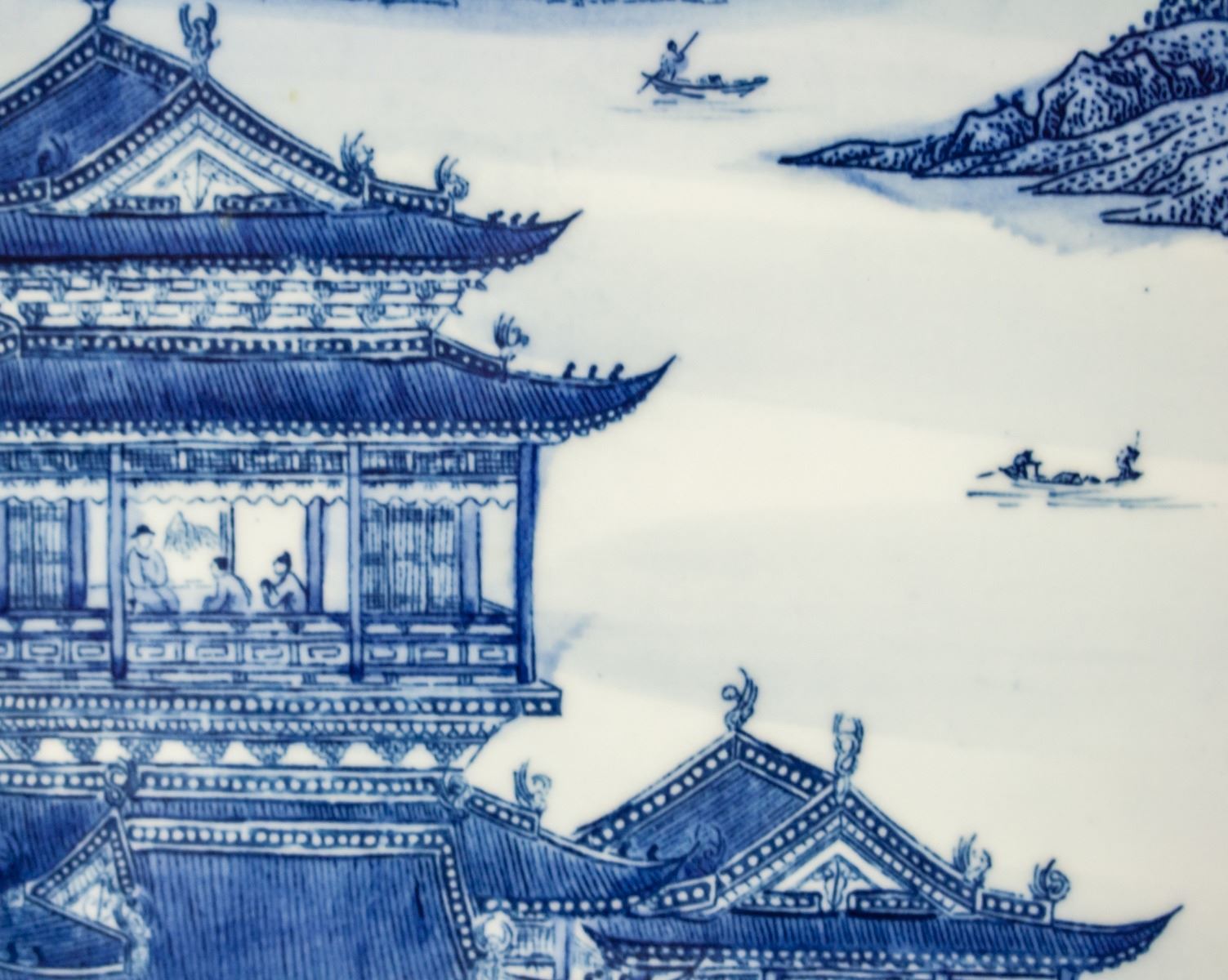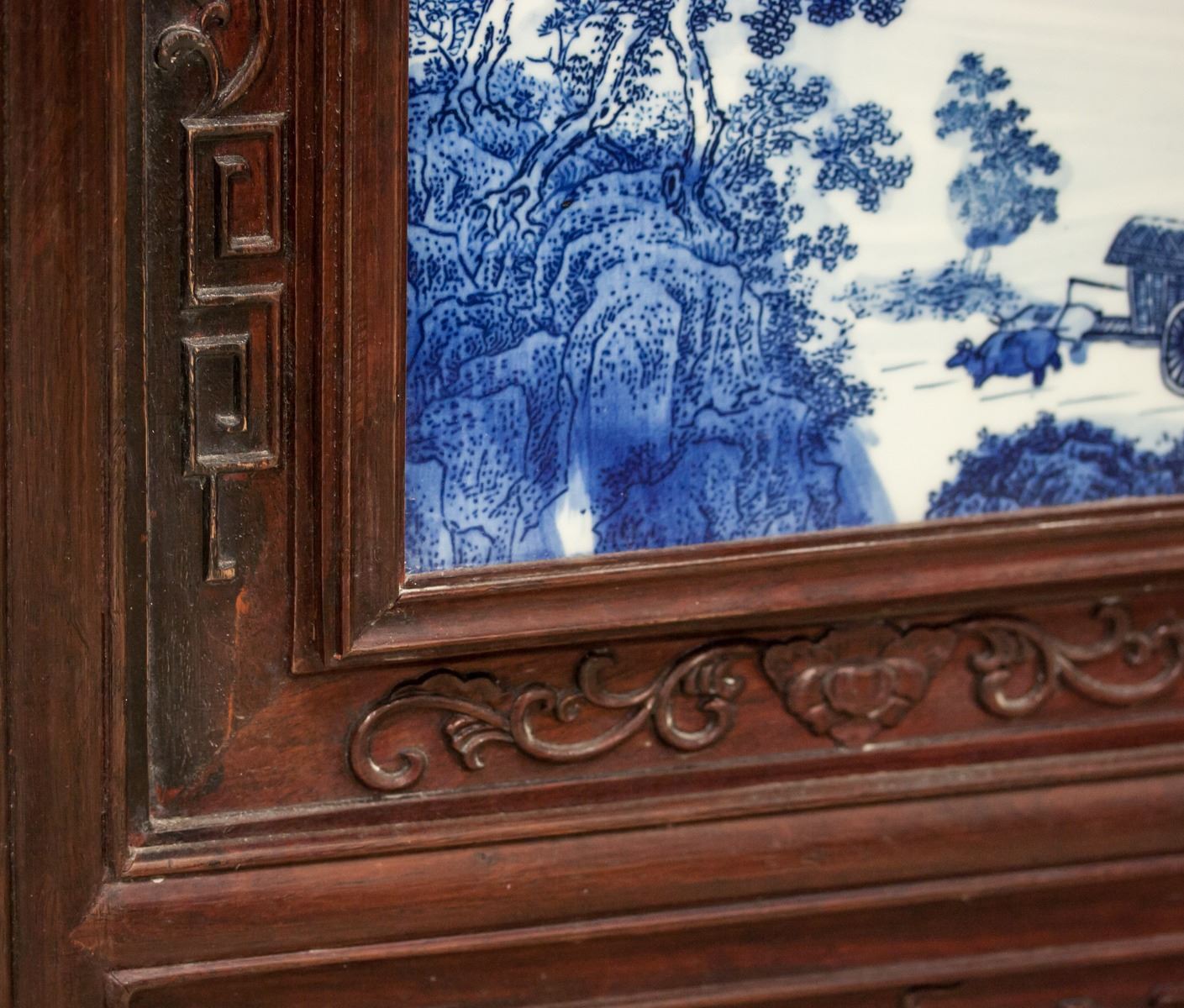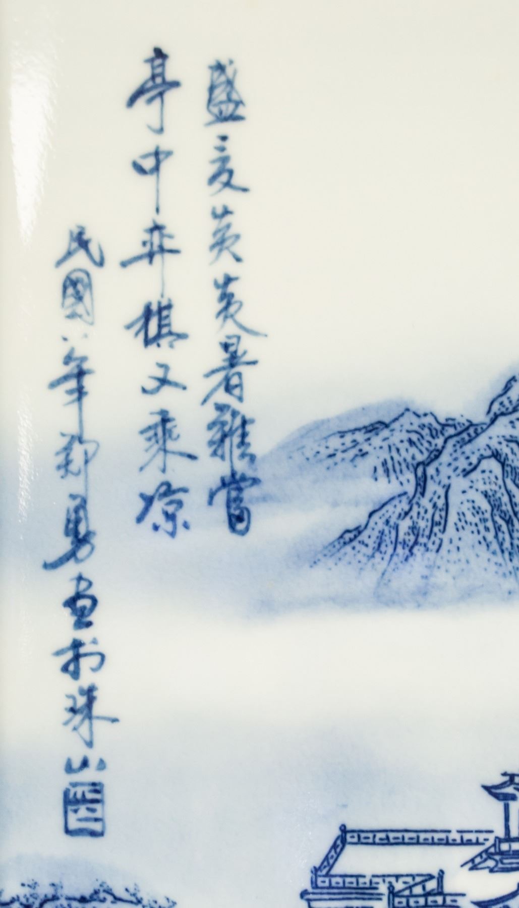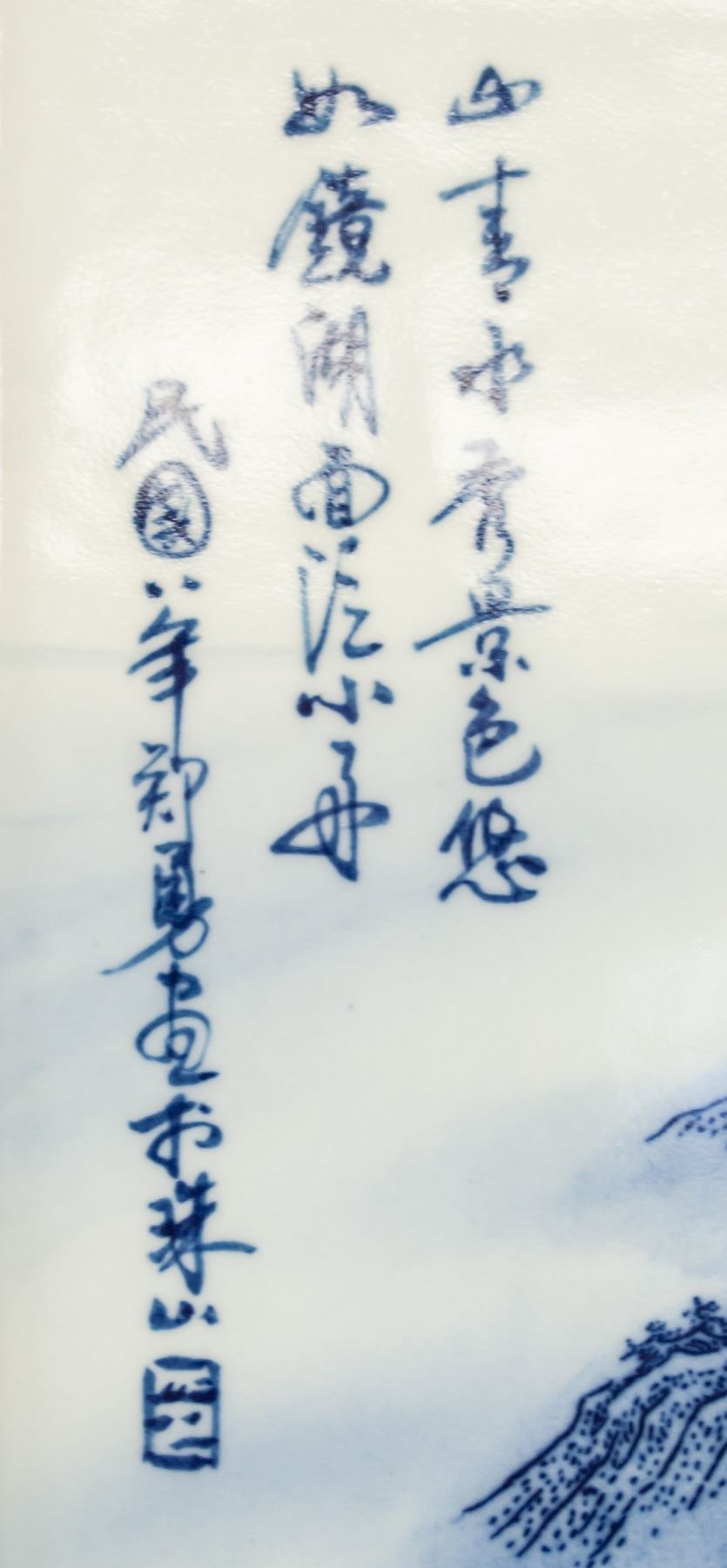 Four (4) pieces porcelain plaque screens. Featuring blue and white mountainous landscape. Signed Zheng Yong. 126 x 36 cm, 8.5kg (each)