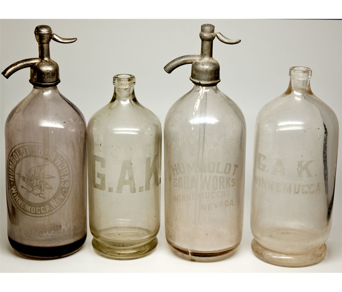 Lot of only known 4-piece set. (1) 11.75", front etched HUMBOLDT SODA WORKS WINNEMUCCA, NEV. with eagle symbol. Some bubbles and staining, siphon head and tube intact. Metal siphon head engraved H.S.W. (2) 11.75", front etched HUMBOLDT SODA WORKS WINNEMUCCA NEVADA. Staining, siphon head and tube intact, metal siphon head has small crack at edge, engraved HUMBOLDT SODA WKS. (3) 9" by 3" with footed base, front etched in large letters G.A.K. Clear glass, surface scratches, some bubbles and surface wear. Holds 8 ounces less than the larger seltzers, the only such smaller seltzer bottle known from Nevada, according to "Nevada History Through Glass, The Nevada Bottle Book, Volume I" by Fred N. Holabird. (4) 10" by 4" front etched G.A.K. WINNEMUCCA. Surface scratching and wear, some air bubbles, small crack in footed base but intact, clear glass. Holabird said, "There were several different bottles made for the Humboldt Soda Works. Gus Krenkle bottled his soda in an aqua Hutchinson soda bottle with his initials "G.A.K." None of the bottles were made with the Winnemucca town name, perhaps because of the horrible misspelling experienced by Henry Busch that Krenkle did not want to repeat. Busch's bottles bore the embossing "Minnemucca."" -59424