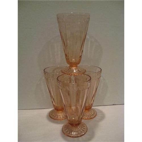 We are offering you four (4) fantastic Pink Depression Glass Footed Ice Tea Tumblers. Each tumbler is molded with the Scalloped and optic pattern and each one is in SUPERIOR condition with no chips, cracks, or dings and each one measures 3.5" in diameter and stands 7" tall. Sorry to say I am not certain of the manufacturer.