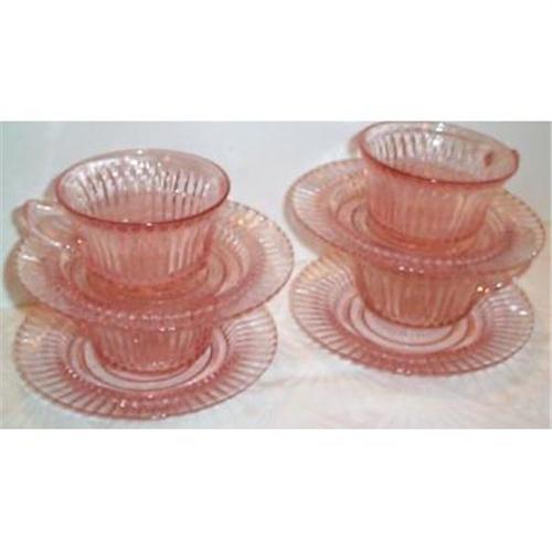 <tr><td>Title:Four Pink Queen Mary Depression Cups Saucers</td></tr>