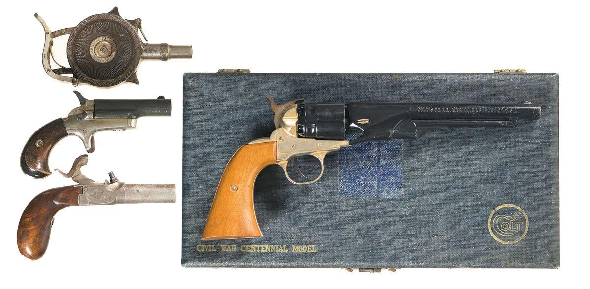 A) Produced in the 1890s. Floral engraved barrel and frame, knurled side plate border, checkered grip panel and matching numbers. Panel absent from right side and plunger. Action needs work, doesn't function.
