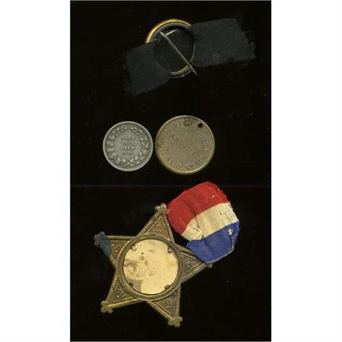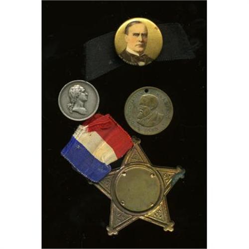 <B>Four Political Medals and Tokens, Washington to McKinley.</B></I> Includes: <B>Paquet Circa 1862 Washington Birth and Death</B></I>, Baker-155A, R.5, silver, 18 mm, light wear over silver-gray surfaces; <B>Five-Pointed Star Medal With Benjamin Harrison Cardboard Portrait</B></I>, fading to cardboard and discoloration at lower left star point, otherwise good condition; <B>Benjamin Harrison Republican Candidate for President Token</B></I>, copper alloy, holed at top, minor discoloration at margins; and a <B>McKinley Pinback Button With Black Ribbon</B></I>, possibly a mourning piece, severe black-and-white portrait of the President against gold background.<BR><BR><b>Shipping:</b> Coins & Currency (<a target="_blank" href="http://www.heritageauctions.com/common/shipping.php">view shipping information</a>)