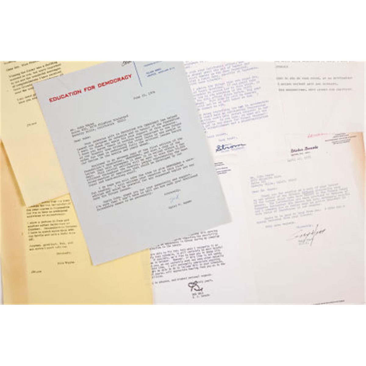 Four Politician Signed Letters, 1970s. The first typed on United States Senate letterhead, to JW in Hollywood, CA, dated "April 15, 1974," regarding campaign help, signed in black felt-tip ink in the lower right corner "Bob" [Dole]; the second typed on similar letterhead, to JW in Hollywood, dated "June 7, 1974," regarding campaign help, signed in black felt-tip ink in the lower right corner "Strom" [Thurmond]; the third typed on Education for Democracy letterhead, to JW in Beverly Hills, CA, dated "June 15, 1976," regarding a donation, signed in blue ballpoint ink in the lower right corner "Ted" [Spiro T. Agnew]; the fourth typed on United States Senate letterhead, to JW in Beverly Hills, CA, dated "April 12, 1978," regarding the Panama Canal, signed in black felt-tip ink in the lower right corner "Gary Hart;" also included are two file copies of 1970s letters Wayne sent to Agnew and Dole. (Please go to our website to see images of each piece.)11" x 8 1/2" and smaller