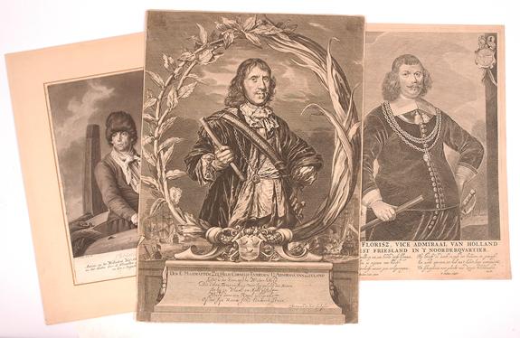 Various. Four Portraits of Dutch Naval Officers & Ship Captains, Two 17th Century. (1) Engraving, "Den E. Manhaften Zee Held Cornelia Evertsen Lt. Admiraal Van Zeeland," engraved by Aarnout de Jode, 19 x 13½ inches (closed 2½ in. tear at lower edge) (2) "Pieter Florrisz, Vice Admiraal Van Holland en West Friesland in 'T Noorderquartier," by P. Holsteyn, after Abraham Liets, 15½ x 11¾ inches (3) mezzotint of Christiaan Cornelis, sailor on the ship "Friendship," 12¼ x 8¼ inches (4) and a lithograph of an officer standing onboard shsip, by F. B. Waanders, after Pieneman, 24¾ x 17¼ inches (damage in upper right background, left edge tear, and lower edge chips--image is bright and clear).