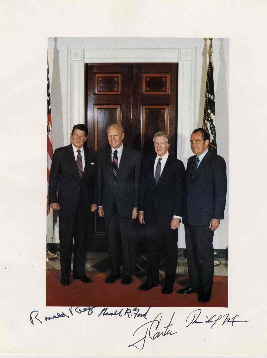 Stunning photograph signed by four Presidents, from left to right, Ronald Reagan, Gerald Ford, Jimmy Carter and Richard Nixon. All have signed in blue ink below their respective images. Color photo measures 8'' x 10'' and is in near fine condition. A rarity.