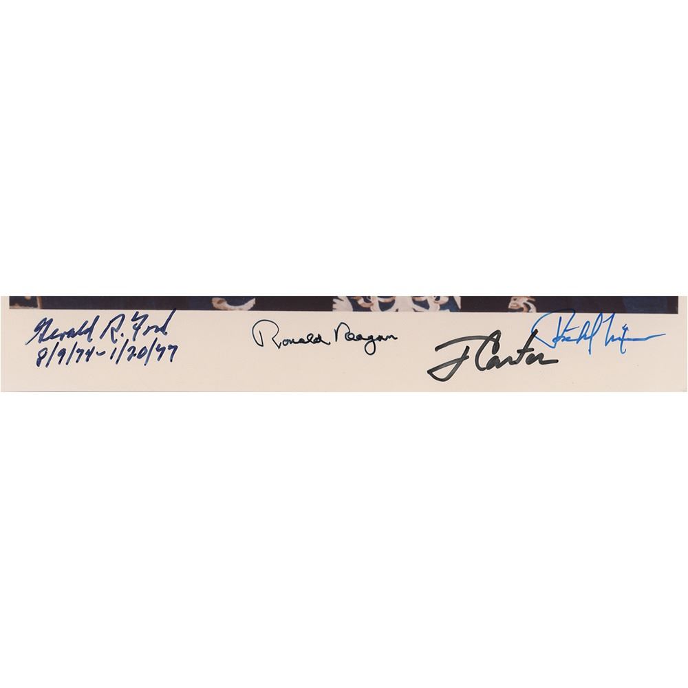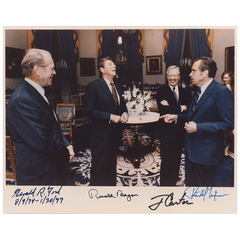Uncommon color satin-finish 10 x 8 photo of Presidents Nixon through Reagan gathered in the Blue Room prior to leaving for Egypt for Anwar Sadat's funeral, signed in the lower border in felt tip, "Richard Nixon," "Gerald R. Ford, 8/9/74–1/20/77," "J. Carter," and "Ronald Reagan." In fine condition, with a few small surface creases. A sought-after combination of presidents.