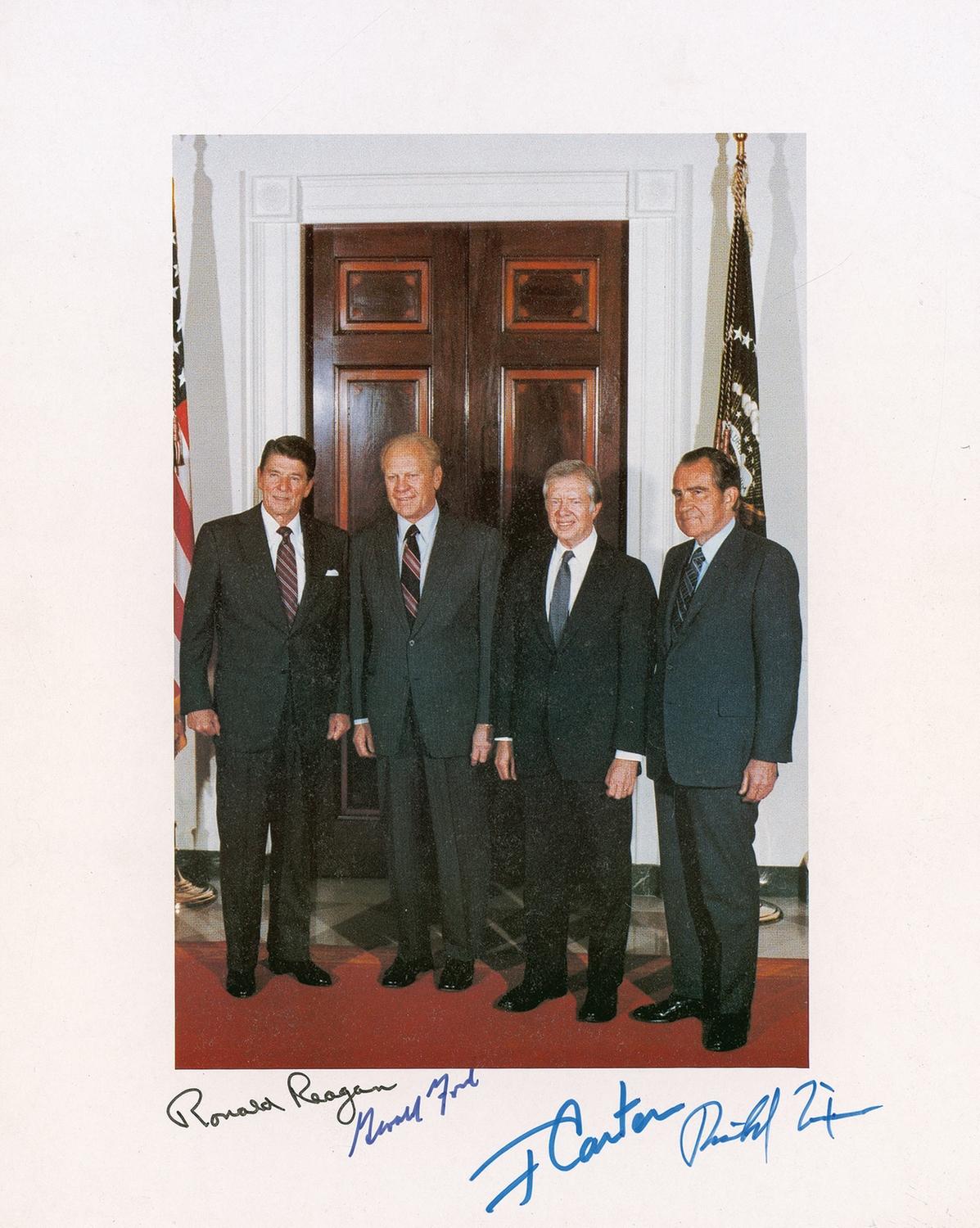 Increasingly scarce color cardstock 8 x 10 photo of presidents Nixon through Reagan gathered at the White House prior to departing for Anwar Sadat’s funeral in 1981, signed in black felt tip, “Ronald Reagan,” and in blue felt tip, “Gerald Ford,” “J. Carter,” and “Richard Nixon.” In fine condition, with a few light corner tip creases. A highly presentable photograph signed by four of the most influential leaders of the latter half of the 20th century!