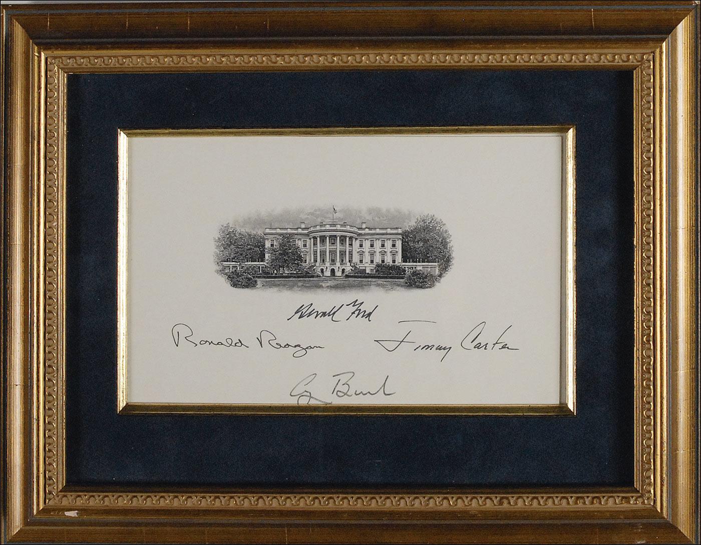 Engraved portrait of the exterior of the White House, 7.5 x 4.75, signed in black felt tip at the bottom border by Gerald Ford, Jimmy Carter, Ronald Reagan, and George Bush. Cloth matted and framed to an overall size of 12.5 x 10. In fine condition. A unique example of the presidency spanning nearly twenty years.
