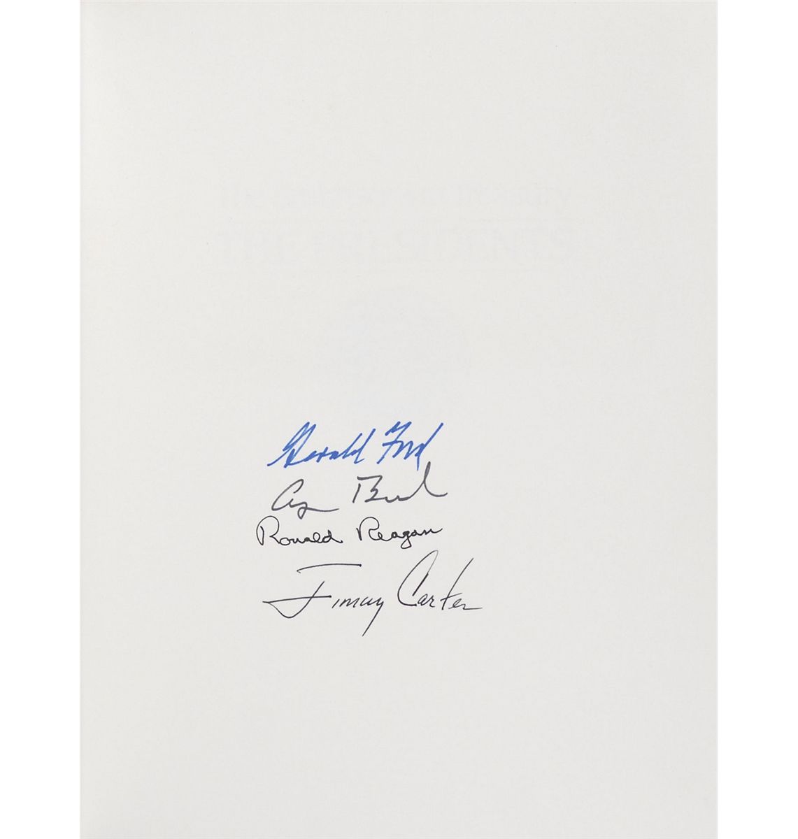 Signed book: The Smithsonian Treasury: The Presidents. First edition, first printing. Washington, DC: Smithsonian Institution Press, 1991. Hardcover, 8.75 x 11.25, 95 pages. Nicely signed on the first free end page in blue and black felt tip by Gerald Ford, Jimmy Carter, Ronald Reagan, and George Bush. In fine condition. A rare combination of presidents encompassing two decades from the mid-1970s into the 1990s.