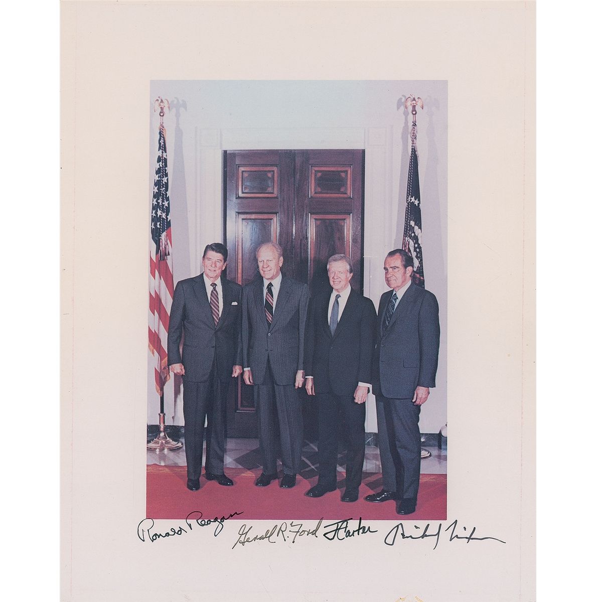Color semi-glossy 8 x 10 cardstock photo of Richard Nixon, Gerald Ford, Ronald Reagan, and Jimmy Carter gathered at the White House preparing to depart for Anwar Sadat’s funeral in 1981, signed in black felt tip. In fine condition, with a few trivial surface marks and creases, a thin line of toning to edges where it was once matted, and a tiny area of soiling to bottom edge; a fantastic example, rarely found with such bold signatures.