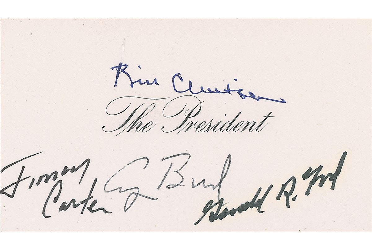 An off-white engraved president card, 4 x 2.25, signed in felt tip and ballpoint by Gerald Ford, Jimmy Carter, George Bush, and Bill Clinton. In fine condition, with slight haloing to Ford’s signature.