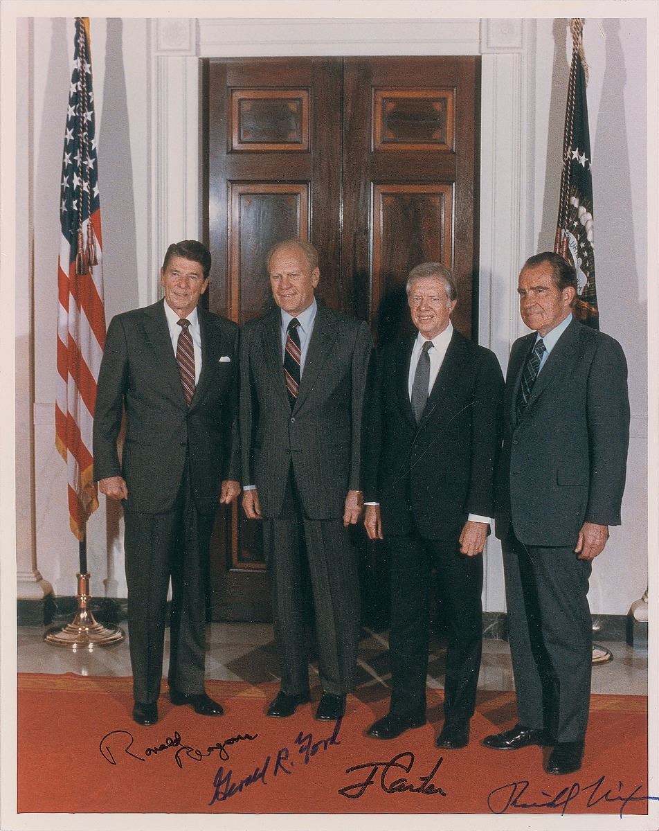 Desirable color satin-finish 8 x 9.75 photo of four American presidents, signed in black felt tip, “Ronald Reagan” and “J. Carter,” and in blue felt tip, “Richard Nixon” and “Gerald R. Ford.” In fine condition.