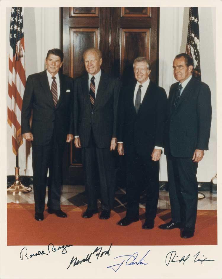 Color satin-finish 8 x 10 photo of Presidents Nixon through Reagan gathered at the White House prior to departing for Anwar Sadat’s funeral in 1981, signed in the lower border in black felt tip, “Ronald Reagan,” “Gerald R. Ford,” and “Richard Nixon,” and signed in blue felt tip, “J. Carter.” In fine condition, with a staple hole to top border, and a few trivial surface marks. A very presentable item signed by four of the most influential leaders of the latter half of the 20th century! Pre-certified John Reznikoff/PSA/DNA and RRAuction COA.