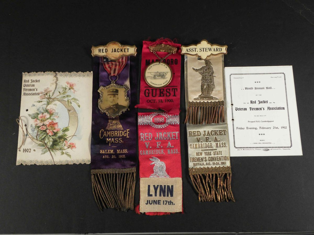 Lot of 4 Red Jacket Fireman's Muster Ribbons and two annual ball invitations. 1898-1903. Good to very good condition.