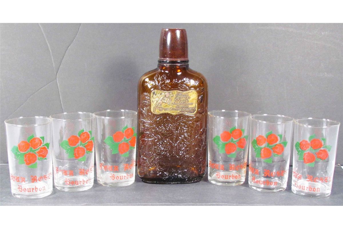 Four Roses Embossed Amber Bottle with 5 Four Roses Glasses. No chips or cracks. Bottle measures 8 1/4 inches tall.
