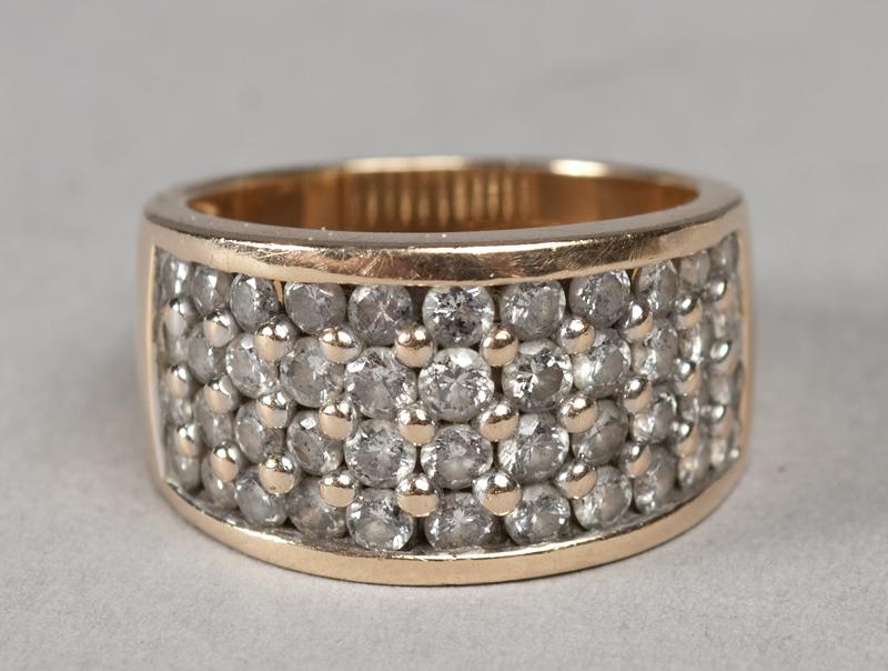 Size 7.75. Prong set with 44 round full cut diamonds, 1.64 cts total weight. Clarity grade: SI-2 to Imp-1, color grade H-J. 7.7 grams total weight. Replacement value $2000, appraisal on file.