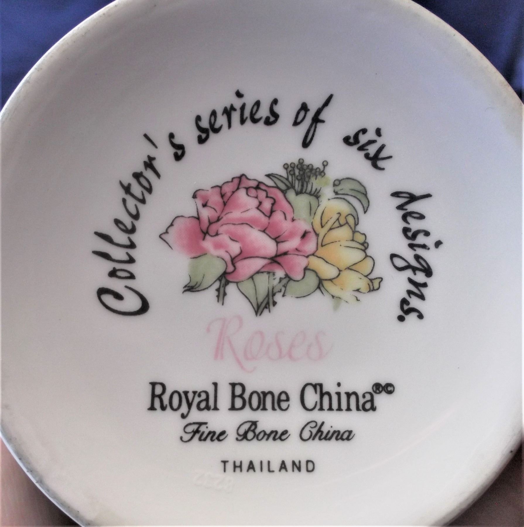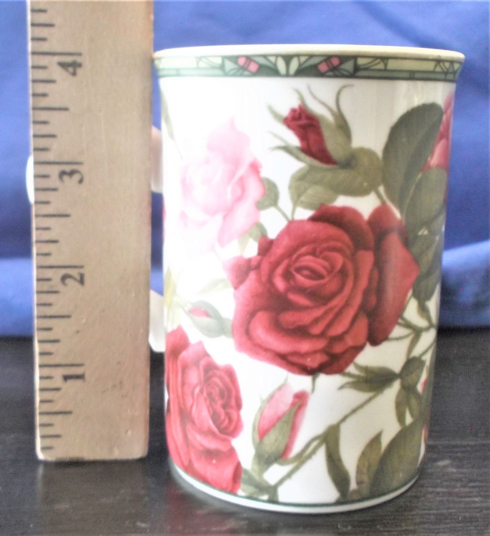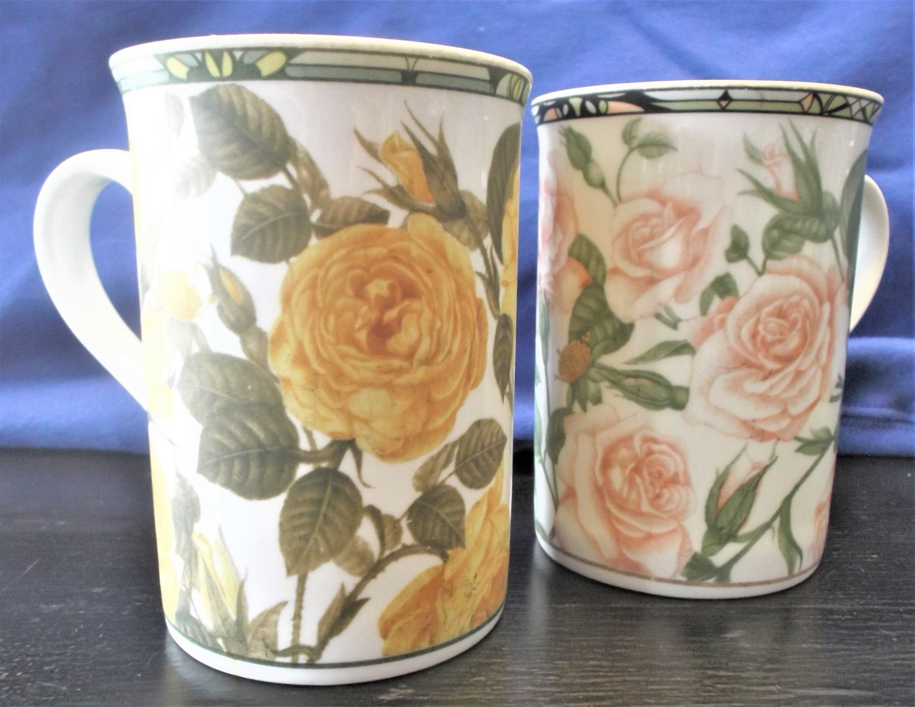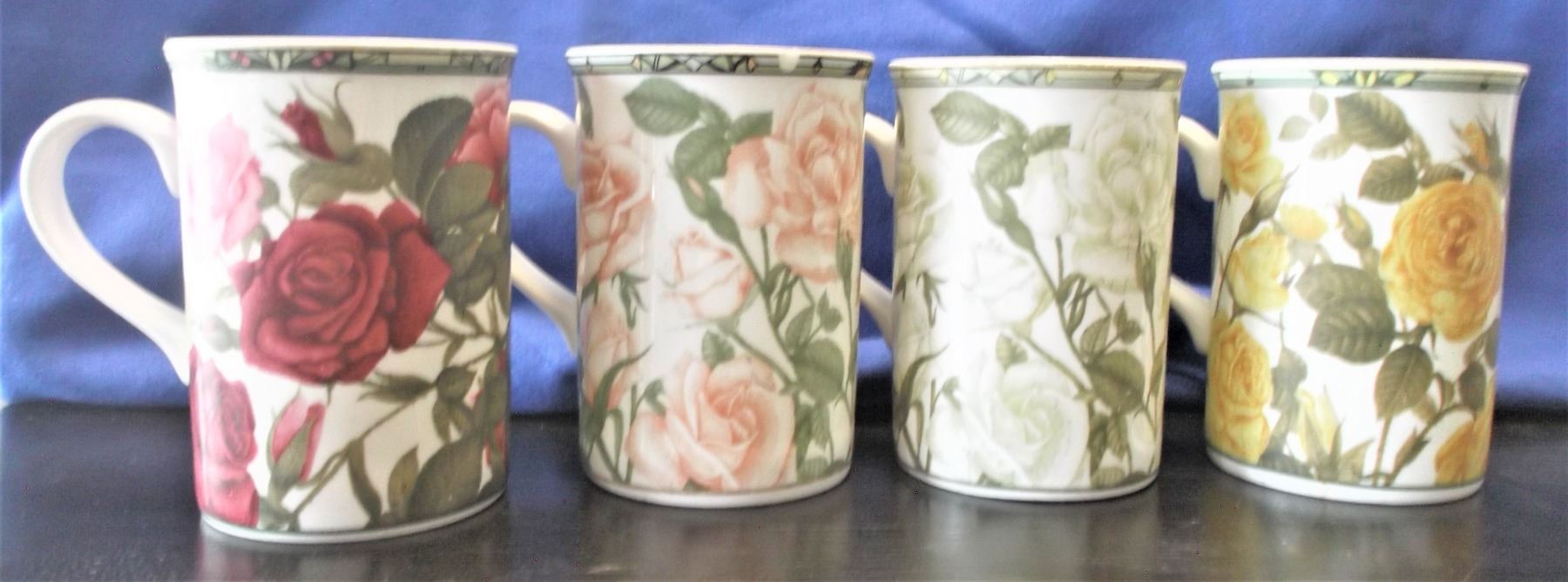 Four different mugs from two different collections, the pink rose mug has a small chip.