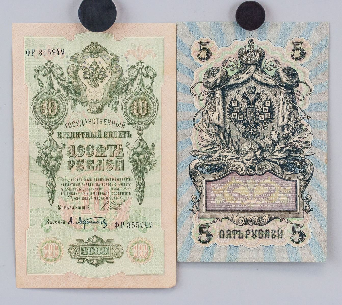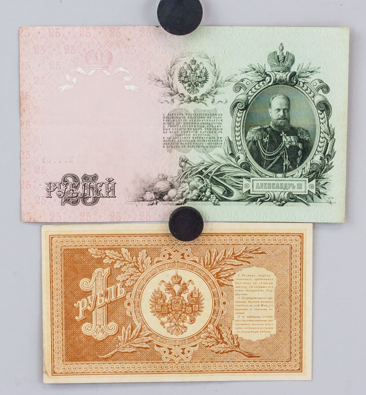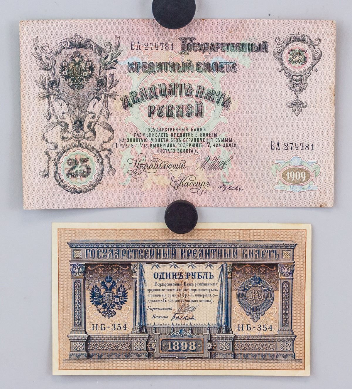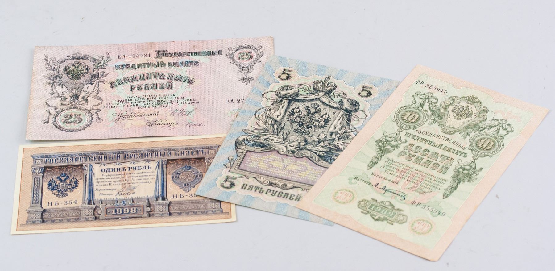 Four (4) 1898-1901 Russian banknotes. Featuring 1 (1898), 5 (1909), 10 (1909), and 25 (1909) rubles banknotes, with serial numbers. Large: 11 x 18 cm, Small: 9 x 15 cm