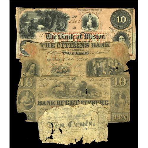 <B>Four Scarce Notes.</B></I><BR><B>Port Hudson, LA- Postmaster of Port Hudson</B></I> 10¢ ?, 1862 <B>Fair</B></I><BR><B>Gettysburg, PA- Bank of Gettysburg</B></I> $10 Mar. 13, 1855 S5 <B>Fair</B></I><BR><B>Weston, VA- Bank of Weston</B></I> $10 18__ G4a Jones BW15-10 Remainder <B>VG,</B></I> edge splits<BR><B>Oshkosh, WI- Citizens Bank</B></I> $2 Oct. 2, 1857 G8a <B>Fair,</B></I> PC.<BR>The Gettysburg and Oshkosh notes are listed as SENC in Haxby. Also included in this lot are 28 pages of a counterfeit detector sans cover dated June 11, 1856. Interesting and useful Obsolete note information can be gleaned from its pages. <I>There will be no returns on this lot for any reason.</B></I> <BR><BR><B>Importa