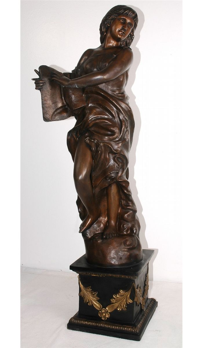 Bronze statue on bronze stand of Four Seasons. Base decorated with gold colored design giving the piece a unique and distinctive look, 17"W x 57"H x 14"D