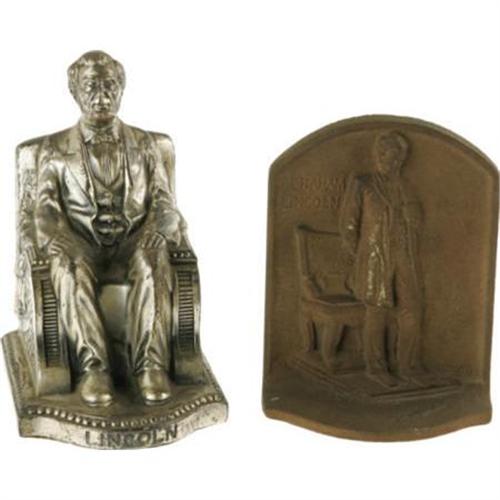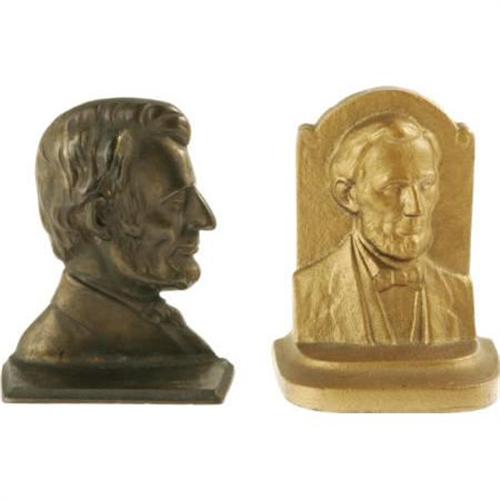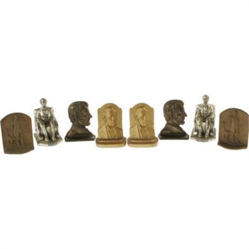 <B>Four Sets of Lincoln Bookends.</B></I> <B>1.)</B></I> 1923 Tombstone-shaped set of Lincoln bookends by A.M. Greenblatt. Shows Lincoln standing in front of a chair. "Abraham Lincoln" in raised letters behind him. Each measures 4.25" wide x 2" deep x 5.75" tall. <B>2.)</B></I> Gold-painted metal set of Lincoln bust on tombstone-shaped background: each measures 4.75" x 2.75" deep x 6.25" tall. <B>3.)</B></I> Bronze-like Lincoln profile set: each measures 4.75" wide x 2" deep x 6.25" tall. <B>4.)</B></I> Silver spelter set of Lincoln seated in chair: each measures 4" wide x 5.25" deep x 6.5" tall. Each one of this set is stamped "© 1926 B.R. Inc." on the back and also "© 1924". One has a small hole between Lincoln's feet; the other shows a small hole in Lincoln's lap. Both are good, with some paint loss throughout. All other bookends very good, with just general age wear. Attractive lot for any book shelf.<BR><BR><b>Shipping:</b> Miscellaneous Collectibles, Larg (<a target="_blank" href="http://www.heritageauctions.com/common/shipping.php">view shipping information</a>)