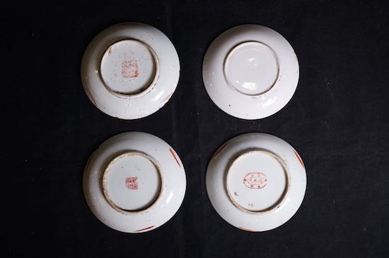 Small Cracks at the edge of one plate . Three of Them with Mark of "Feng Yong Yuan", "?? Yan Zao" and "Yu Feng Heng Cai Ci ?". Condition as is, shown in photos. H: 2.3cm(2), 2cm, 2.5cm,Diameter: 13.3cm(2), 13.6cm(2)