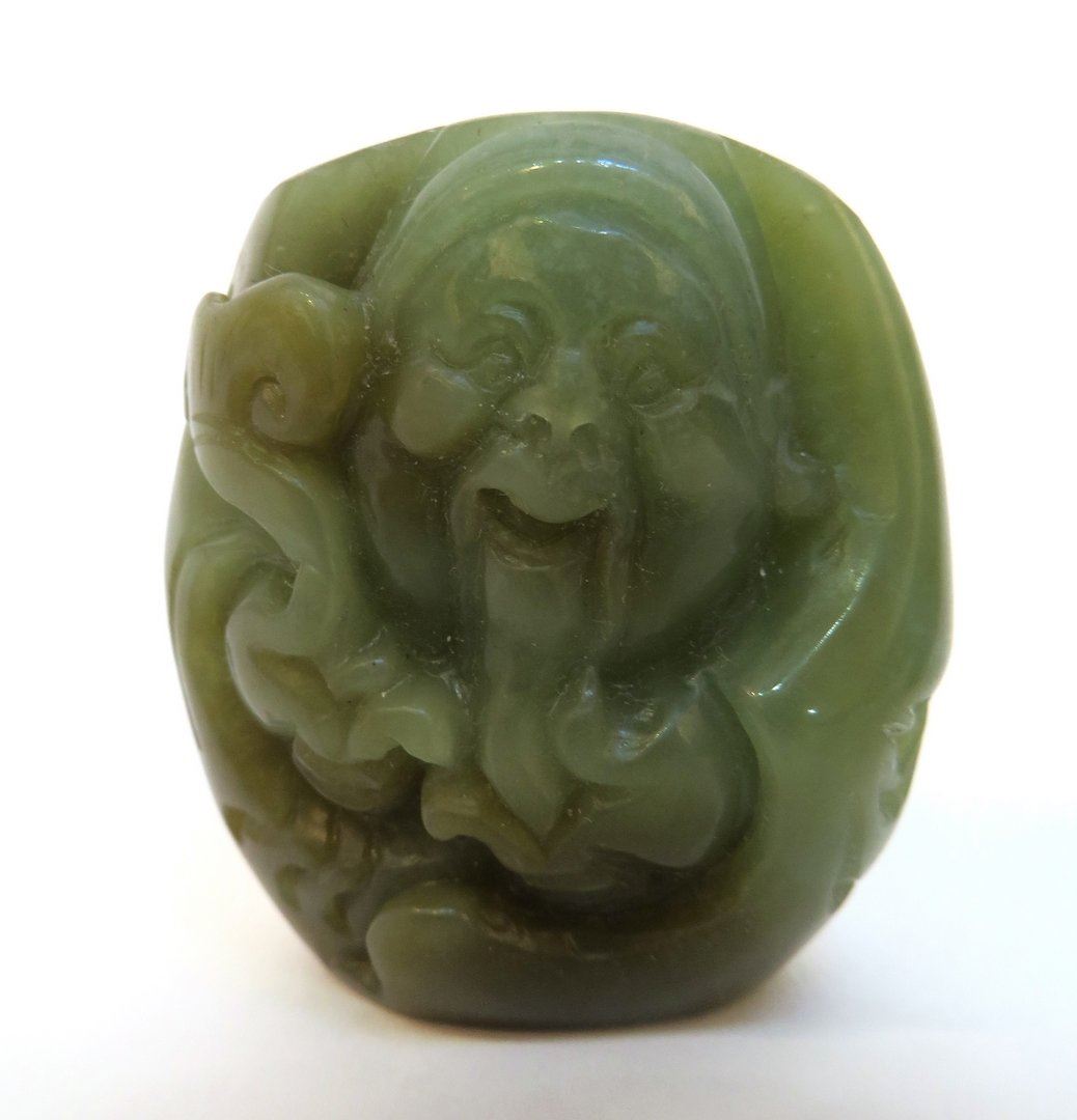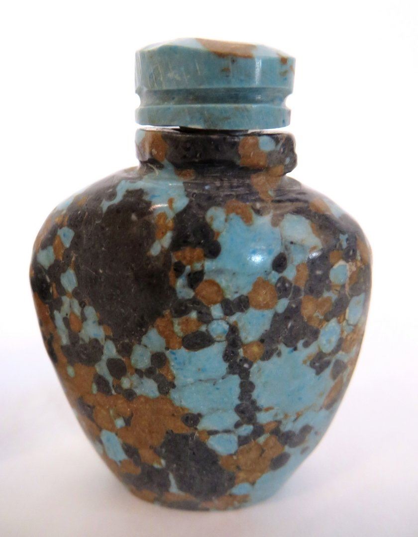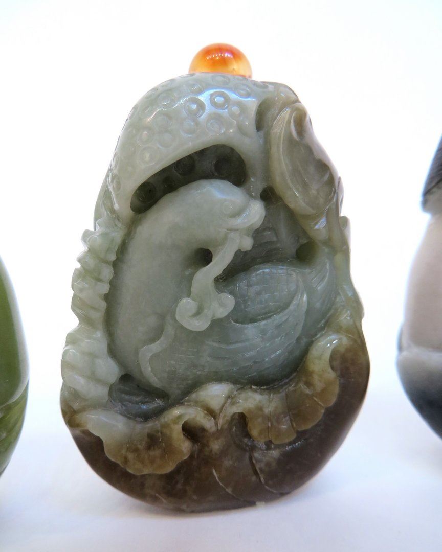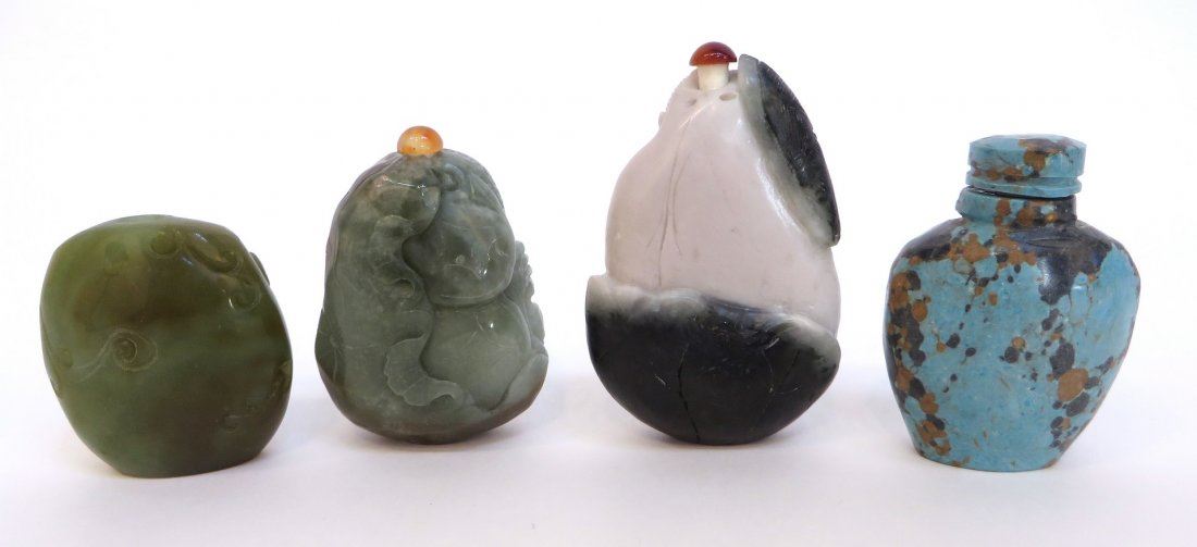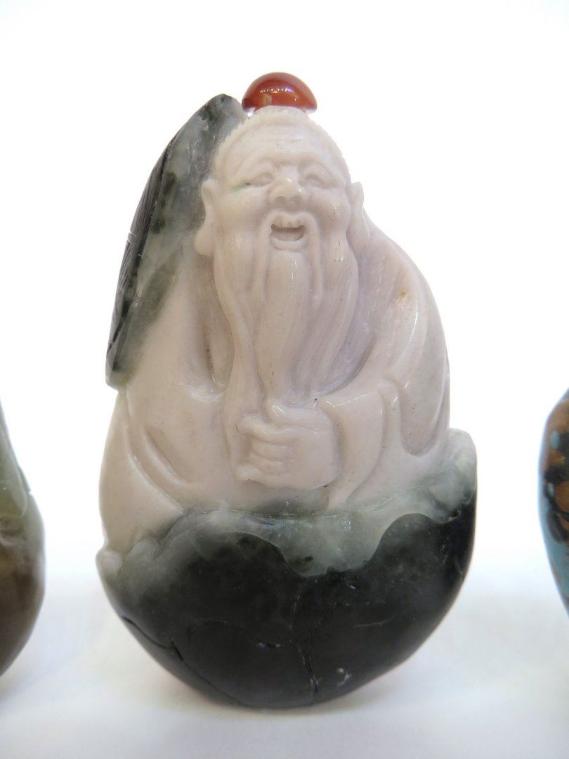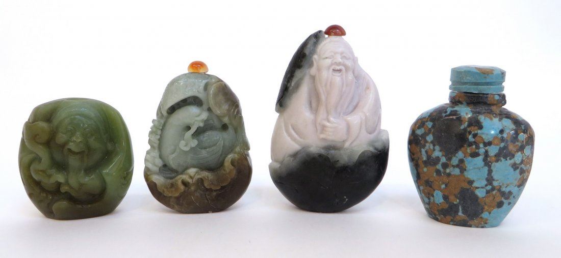 Of jade & stone depicts an elder, a duck, a turquoise floral pattern, and a laughing man. One missing an applicator stopper Only 20 lots in this sale have reserves, marked with "R" at end of description.
