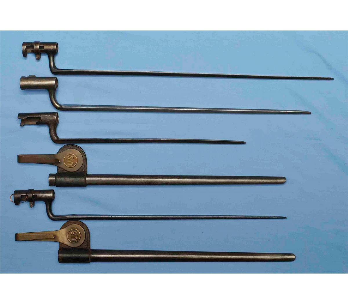1) 22 inch blade. 2) 20 inch blade. 3) 15 inch blade with mismatched metal scabbard. 4) 18 1/2 inch blade with metal scabbard. CONDITION: Fair to good overall.