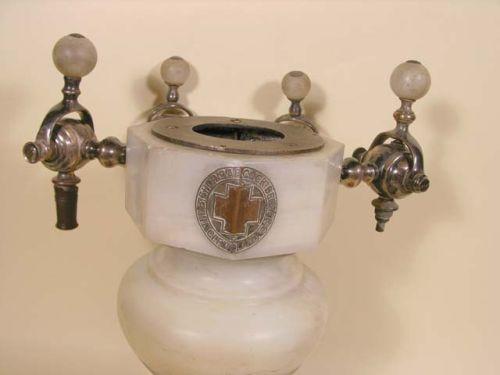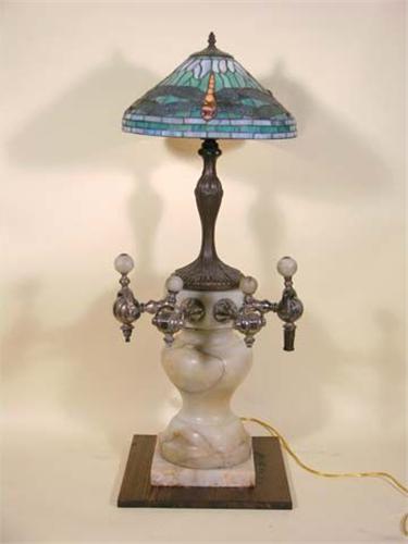 Four spigot marble soda dispenser with leaded glass lamp. Lamp not original to dispenser.