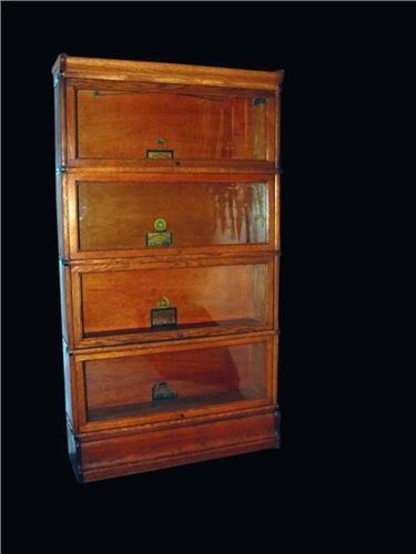 Four Stack Oak Bookcase, by the Globe Wernicke Co. Cincinnati, OH. Original manufacturer stickers on the back of each section. Excellent original condition. 34 X 62 X 11 inches.