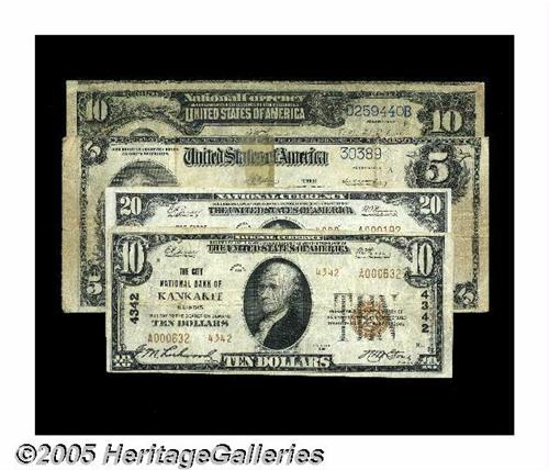 <B>Four State Excursion.</B></I><BR>Kankakee, IL - $10 1929 Ty. 2 The City NB Ch. # 4342 VF<BR>Baltimore, MD - $10 1902 Date Back Fr. 616 The Citizens NB Q Ch. # (E)1384 Fine<BR>Wisner, NE - $20 1929 Ty. 2 The First NB Ch. # 4029 VF, pinholes<BR>Bethlehem, PA - $5 1902 Plain Back Fr. 602 The Lehigh Valley NB</B></I> Ch. # 2050 VG-Fine, repair.<BR>