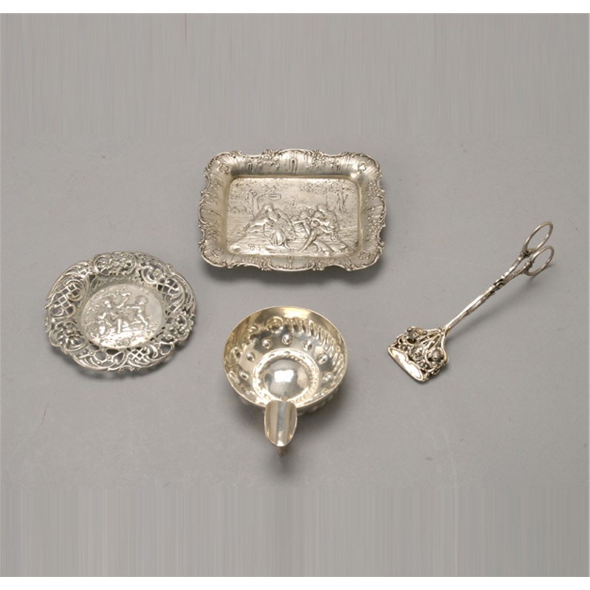 Four Sterling Rococo Revival Items: two small trays; a tongs; and a tastevin {Total silver weight 6.60 troy oz; dimensions of larger tray 4 1/4 x 5 1/8 inches}